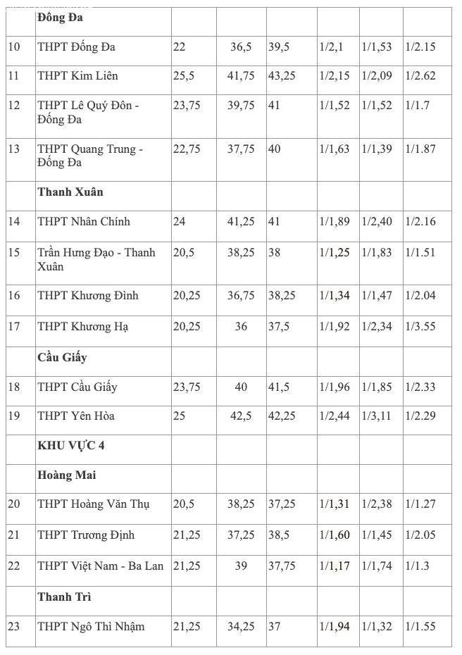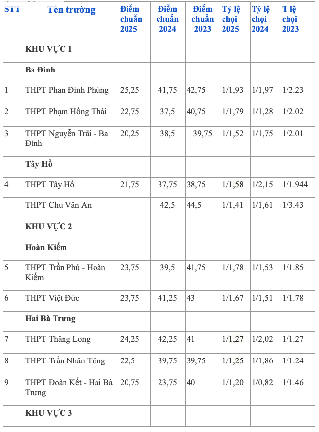 Ngay sau đó là THPT Việt Đức và THPT Phan Đình Phùng cùng 25,25 điểm, còn THPT Yên Hòa đạt 25 điểm – đồng thời là trường có tỷ lệ chọi cao nhất năm.
