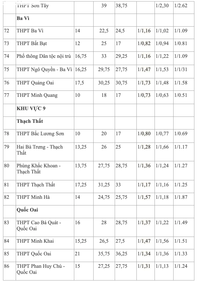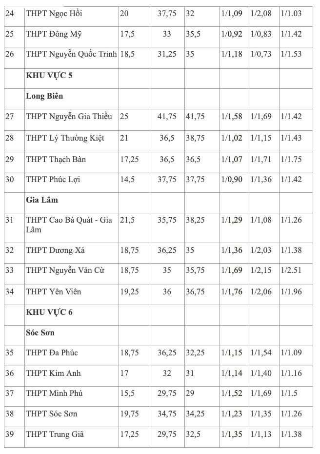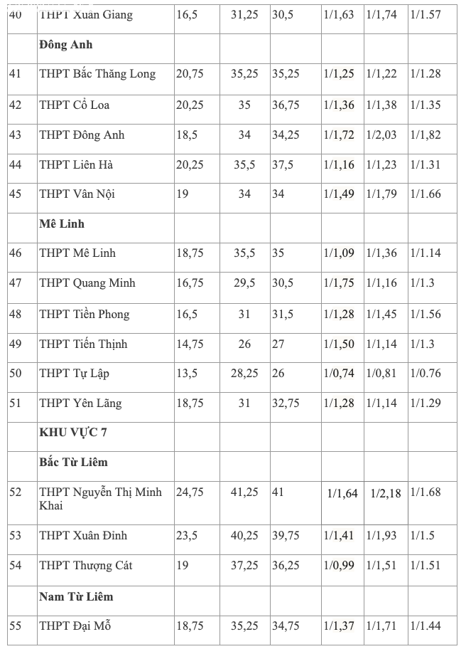 Ngoài ra, nhiều trường có tỷ lệ chọi trên 1/2 như Tây Hồ, Thăng Long, Kim Liên, Nhân Chính, Hoàng Văn Thụ, Ngọc Hồi, Dương Xá, Nguyễn Văn Cừ, Đông Anh, Nguyễn Thị Minh Khai.