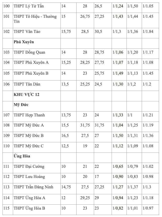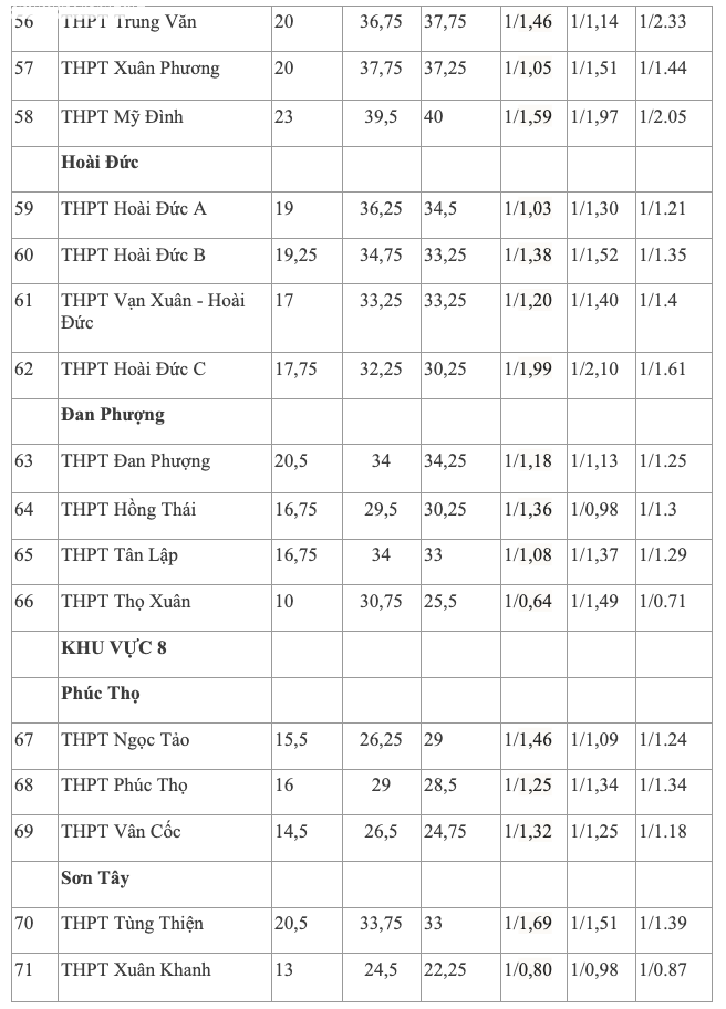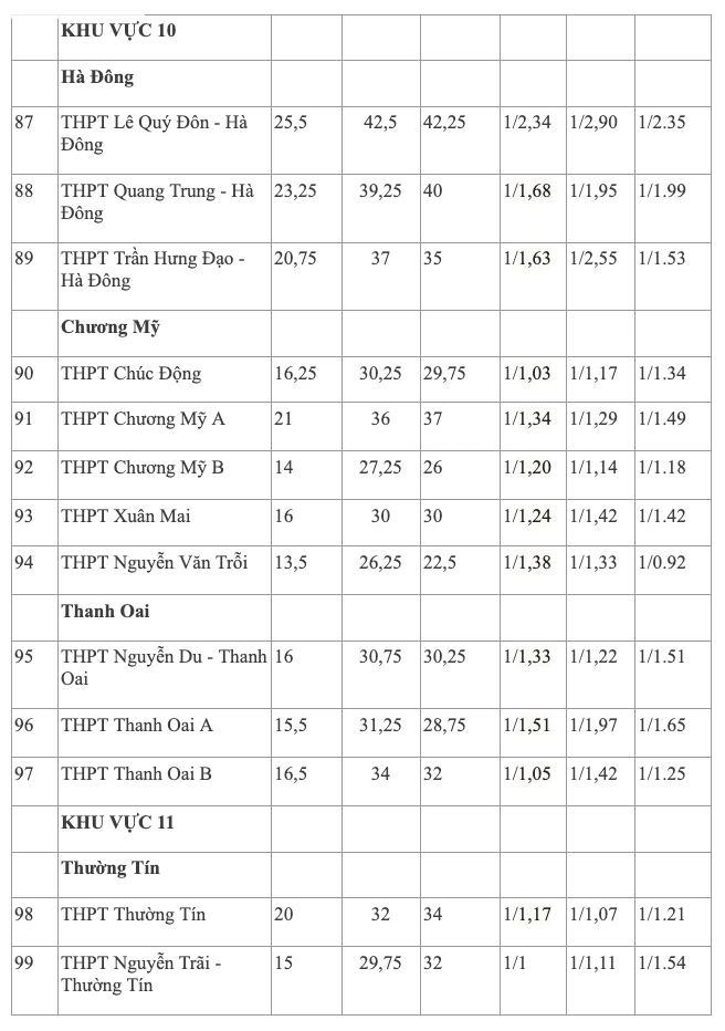 Ngược lại, một số trường như THPT Tự Lập, THPT Thọ Xuân, THPT Xuân Khanh, THPT Bất Bạt, THPT Minh Quang, THPT Bắc Lương Sơn, THPT Lưu Hoàng, THPT Ứng Hòa B có tỷ lệ chọi thấp, thậm chí số hồ sơ đăng ký ít hơn chỉ tiêu.