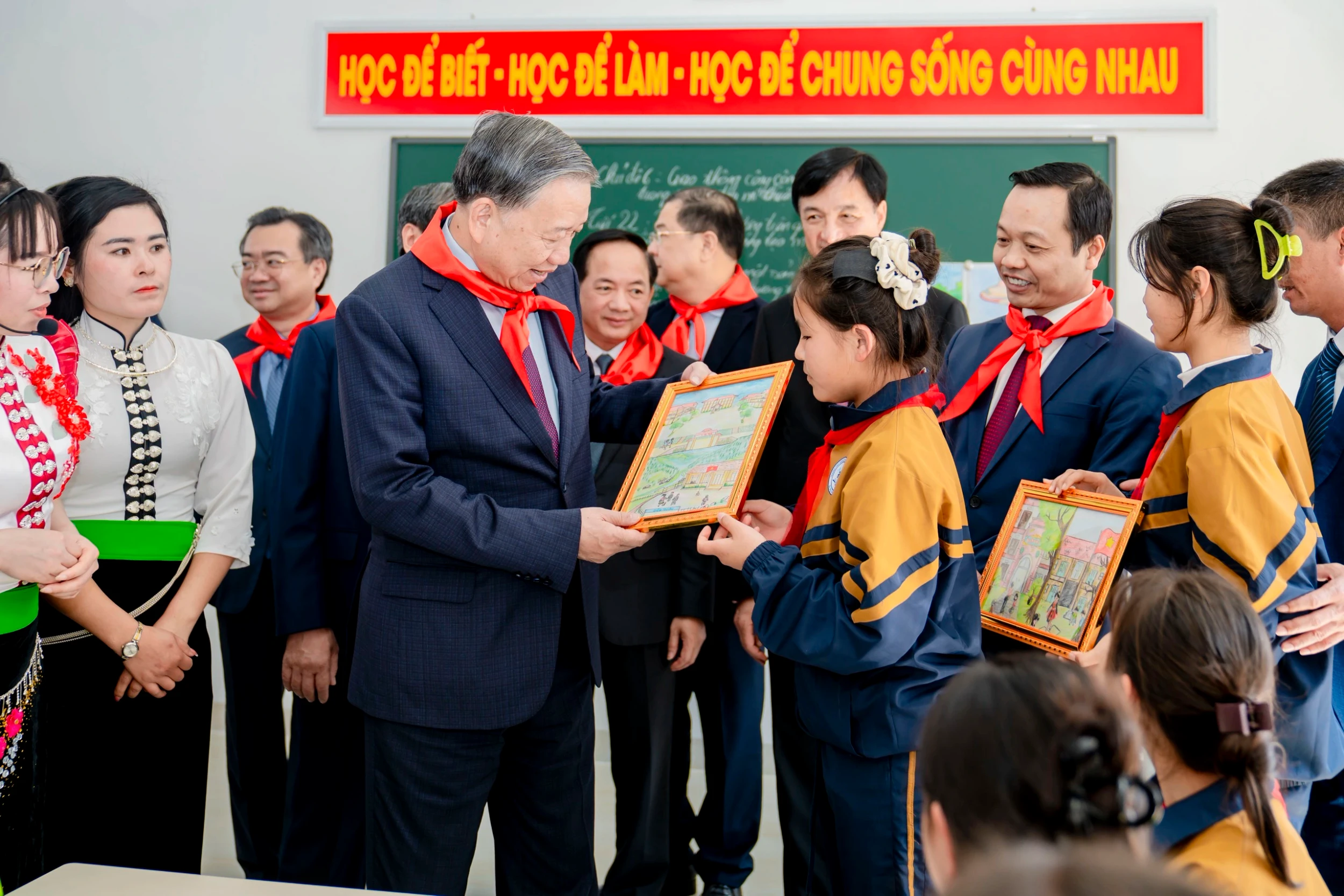 Tổng Bí thư cùng các đại biểu thăm cơ sở vật chất của trường và chụp ảnh cùng học sinh. Ảnh: ĐIỆN BIÊN
