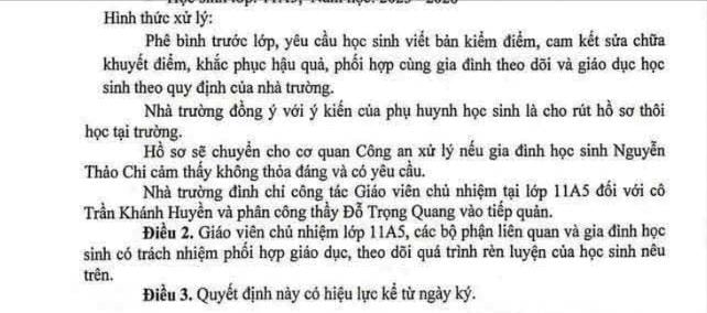 Sau khi xem xét vụ việc, nhà trường đã đình chỉ công tác chủ nhiệm của giáo viên lớp 11A5 và điều chuyển sang giáo viên khác do đánh giá còn thiếu kinh nghiệm trong xử lý tình huống.
