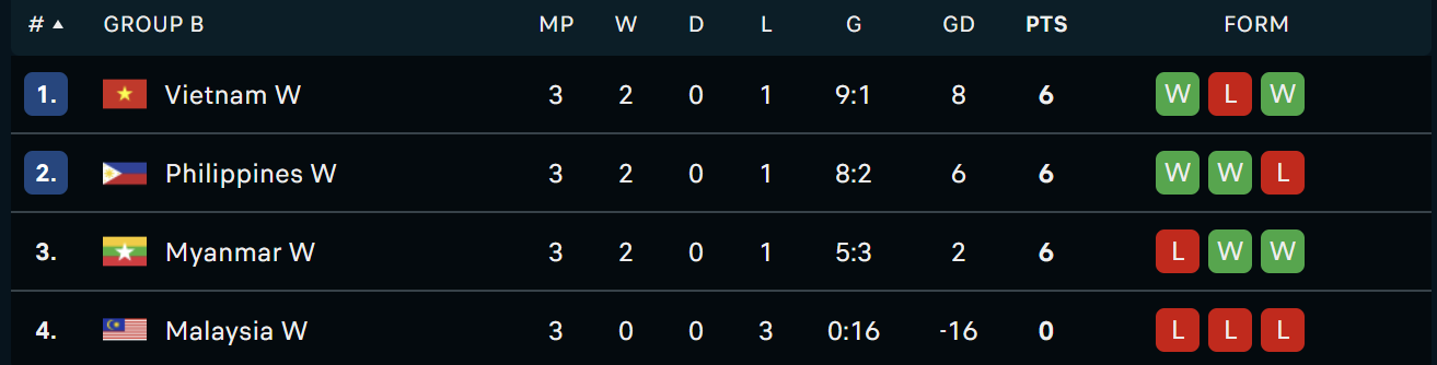 Việc tuyển nữ Việt Nam đoạt ngôi đầu vì Philippines chỉ thắng được Malaysia 6-0 ở loạt cuối, qua đó có cùng 6 điểm như Việt Nam song thua về hiệu số bàn thắng bại (+6 so với +8). Lưu ý, Philippines dù từng thắng Việt Nam 1-0, song lại thua Myanmar 1-2 ở lượt trận ra quân.