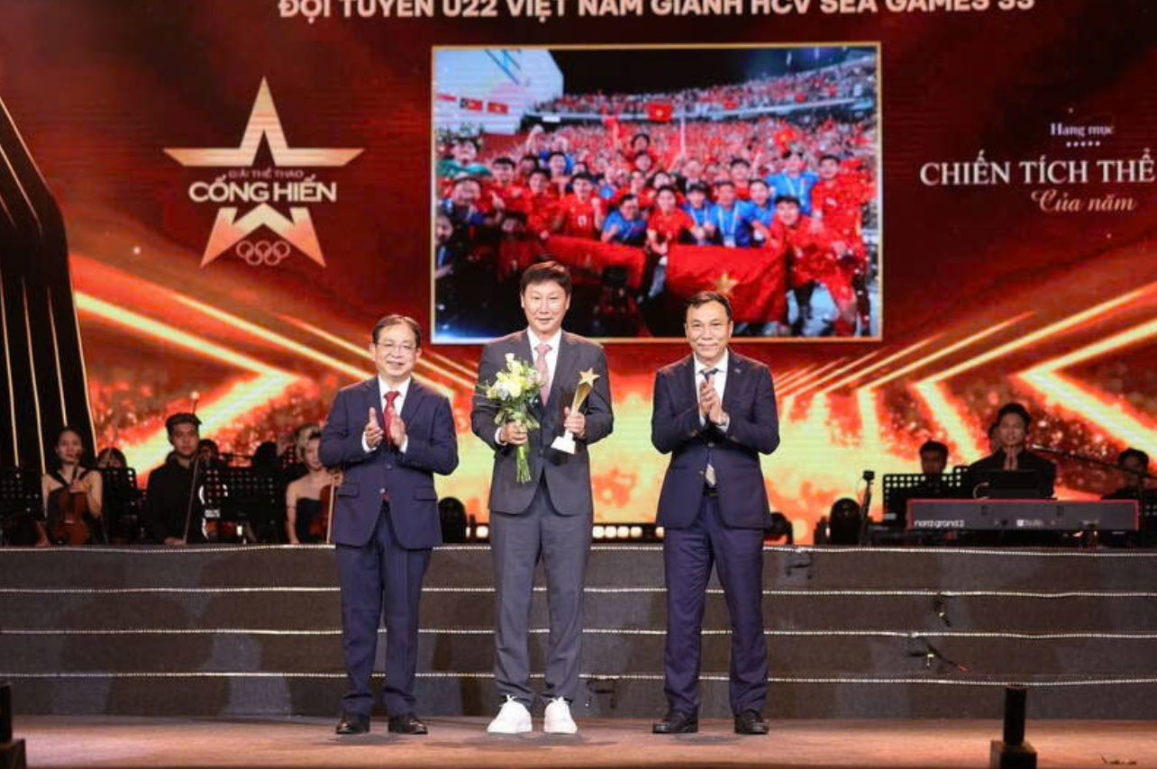 Huấn luyện viên Kim Sang Sik đại diện Ban huấn luyện U22 Việt Nam nhận giải thưởng tại Lễ trao giải Cống hiến lần thứ 20. Ảnh: Ban tổ chức