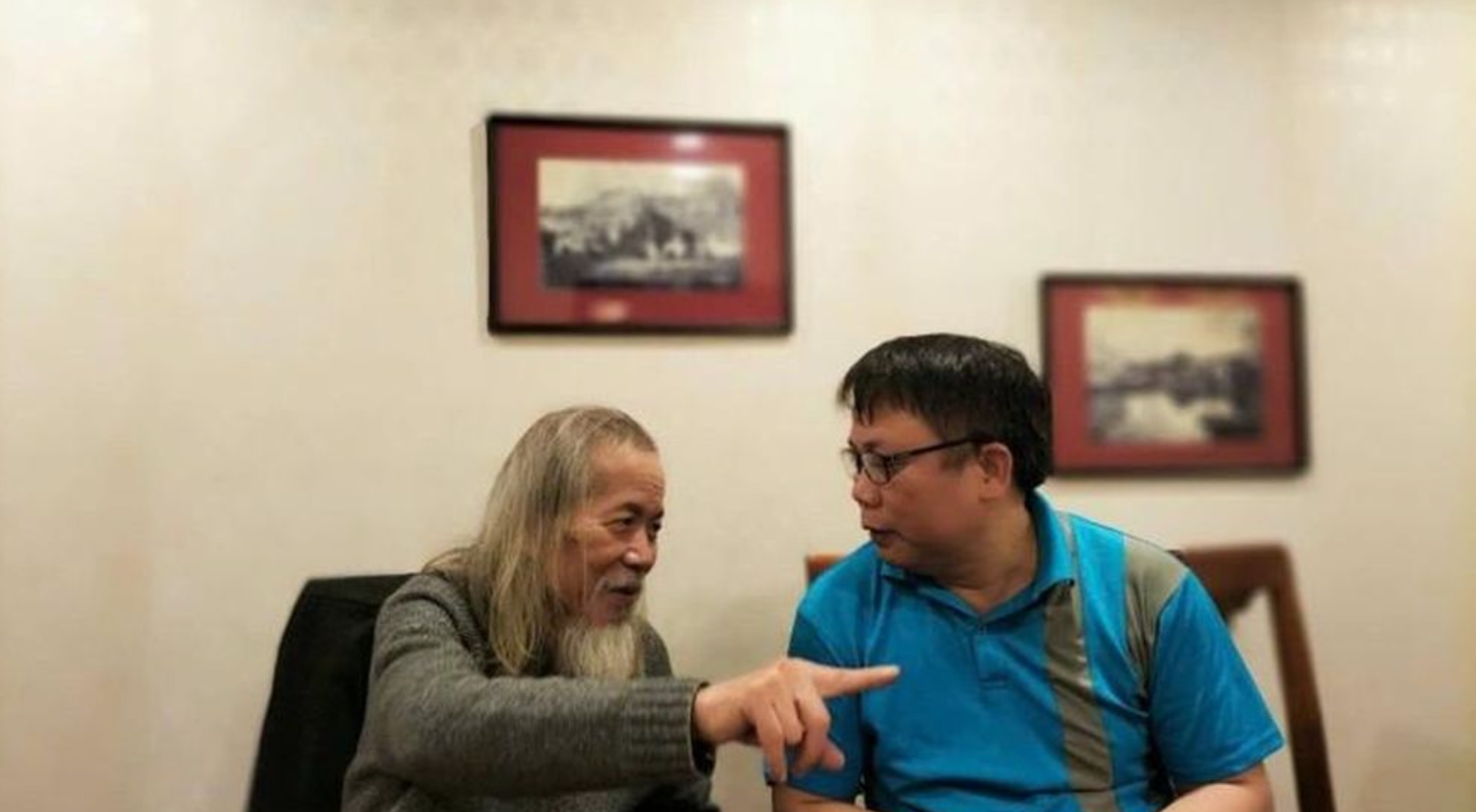 Họa sĩ Lương Xuân Đoàn, Chủ tịch Hội Mỹ thuật Việt Nam (bên trái) trao đổi với họa sĩ Quỳnh Thơm. Ảnh: nhandan