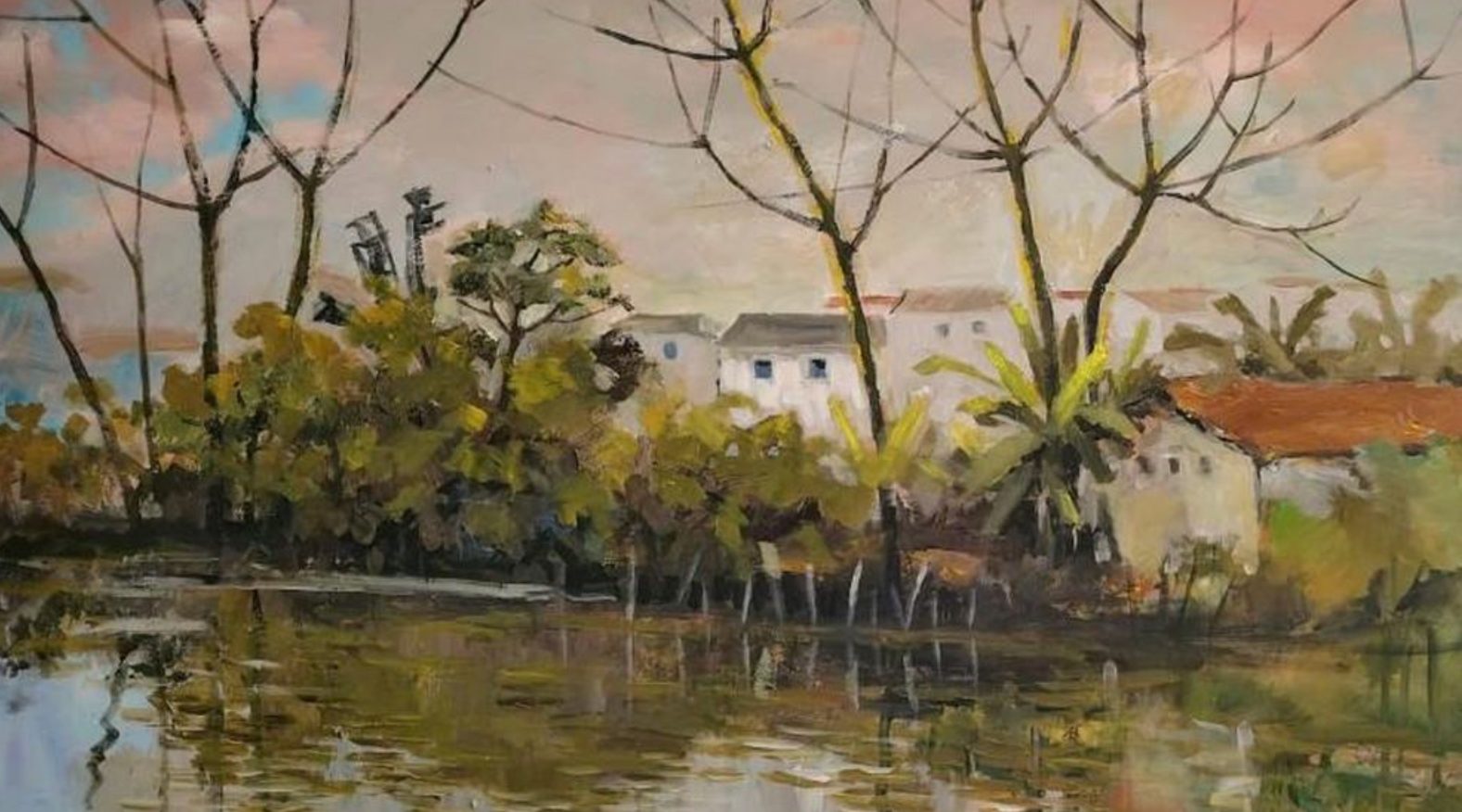 Đề tài nông thôn vốn có vị trí bền bỉ trong hội họa Việt Nam. Hình ảnh cánh đồng, dòng sông, bờ tre, mái nhà… đã trở thành ký ức chung của nhiều thế hệ. Tuy nhiên, mỗi nghệ sĩ lại tìm cho mình một cách tiếp cận riêng. Với Quỳnh Thơm, làng quê là miền ký ức sâu thẳm gắn với tuổi thơ. Những buổi chiều bên ao làng, con đường đất dẫn vào xóm nhỏ hay mùa gặt rộn ràng đã trở thành nguồn cảm hứng xuyên suốt trong sáng tác của anh.