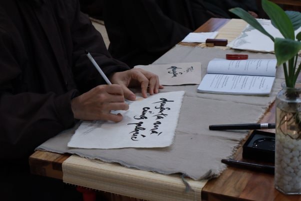 Những câu Kiều được các nhà sư viết trên giấy và sử dụng trong hoạt động rút quẻ Kiều. Ảnh: Hà Mi