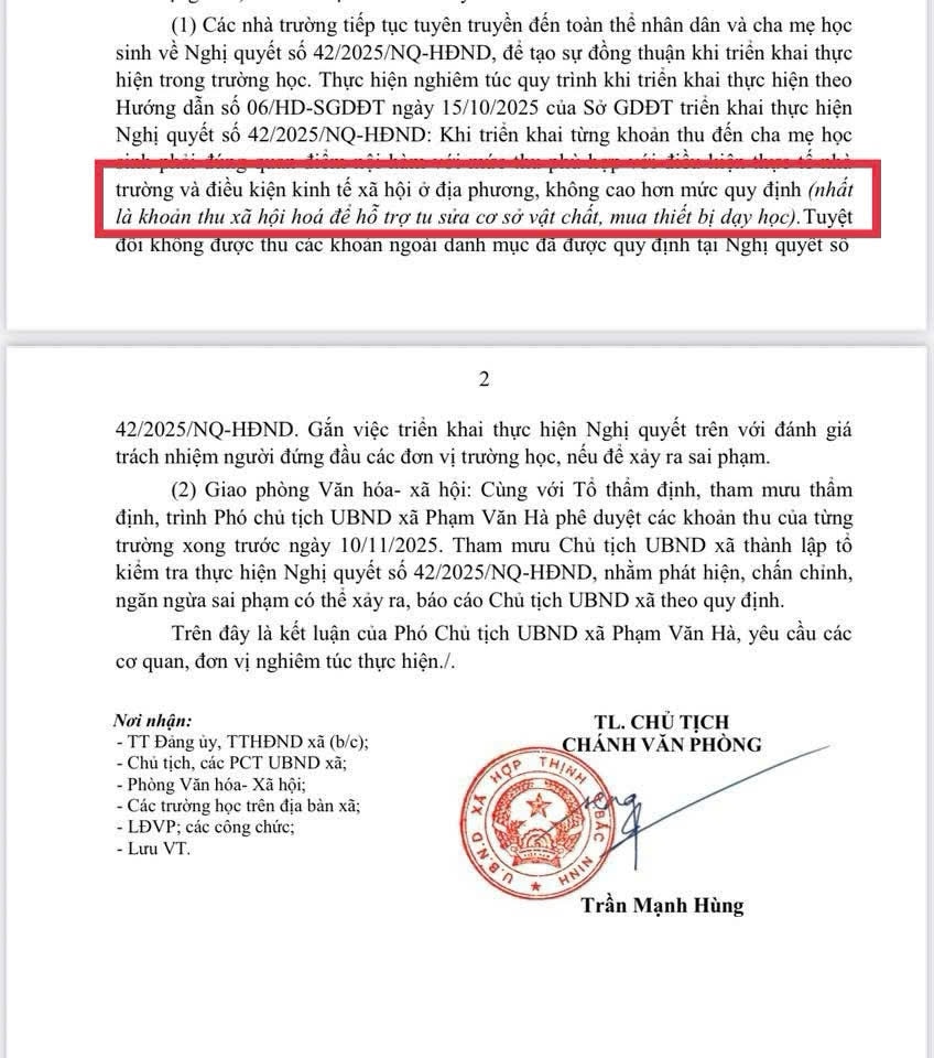 Đối chiếu với Nghị quyết 42 của HĐND tỉnh Bắc Ninh về mức học phí và danh mục thu – chi năm học 2025-2026, khoản thu xã hội hóa đã được quy định rất rõ là khoản vận động, ủng hộ tự nguyện của phụ huynh, hoàn toàn không có nội dung nào giống cách hiểu mà văn bản của UBND xã Hợp Thịnh đang thể hiện.