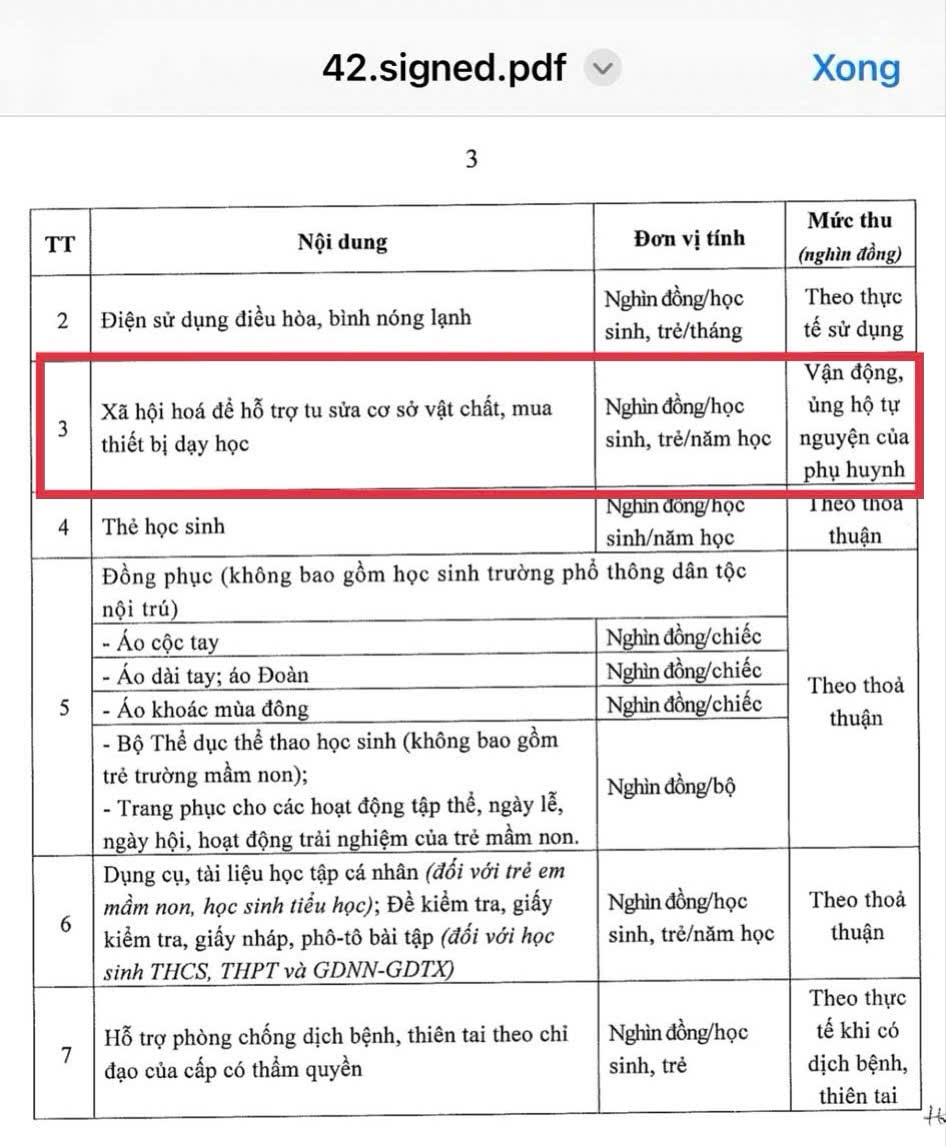 Hiệu trưởng Trường Tiểu học Hợp Thịnh số 1 Vũ Trọng Thao trong buổi họp phụ huynh ngày 26/10 cũng nêu rõ trước đại diện Ban đại diện Cha mẹ học sinh các lớp: “Theo Nghị quyết 42 liên quan mức học phí và danh mục thu chi cho năm học 2025-2026 của HĐND tỉnh Bắc Ninh, xã hội hoá để hỗ trợ tu sửa cơ sở vật chất, mua thiết bị dạy học quy định mức thu là “vận động ủng hộ tự nguyện của phụ huynh”.