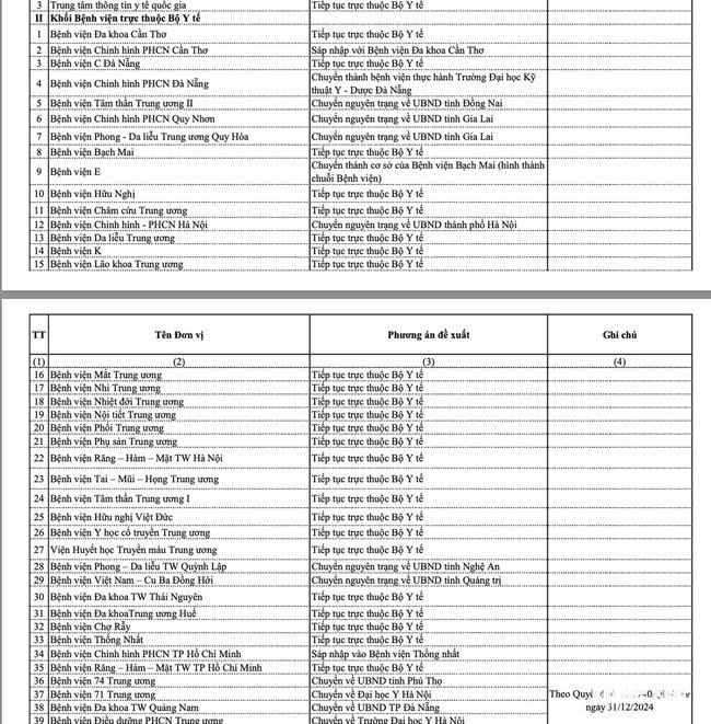 Trong số 39 bệnh viện tuyến trung ương, Bộ đề xuất 25 đơn vị tiếp tục trực thuộc Bộ để bảo đảm năng lực điều trị chuyên sâu, đào tạo và nghiên cứu. Danh sách này gồm các bệnh viện trọng điểm như Bạch Mai, Việt Đức, K, Nhi Trung ương, Phụ sản Trung ương, Chợ Rẫy, Thống Nhất...