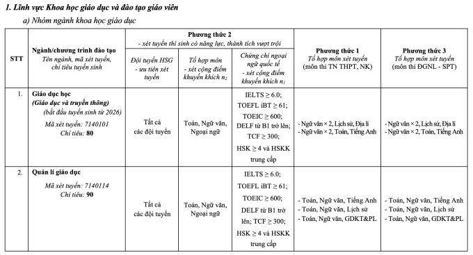 Chỉ tiêu, phương thức xét tuyển của Đại học Sư phạm Hà Nội năm 2026, theo từng ngành.