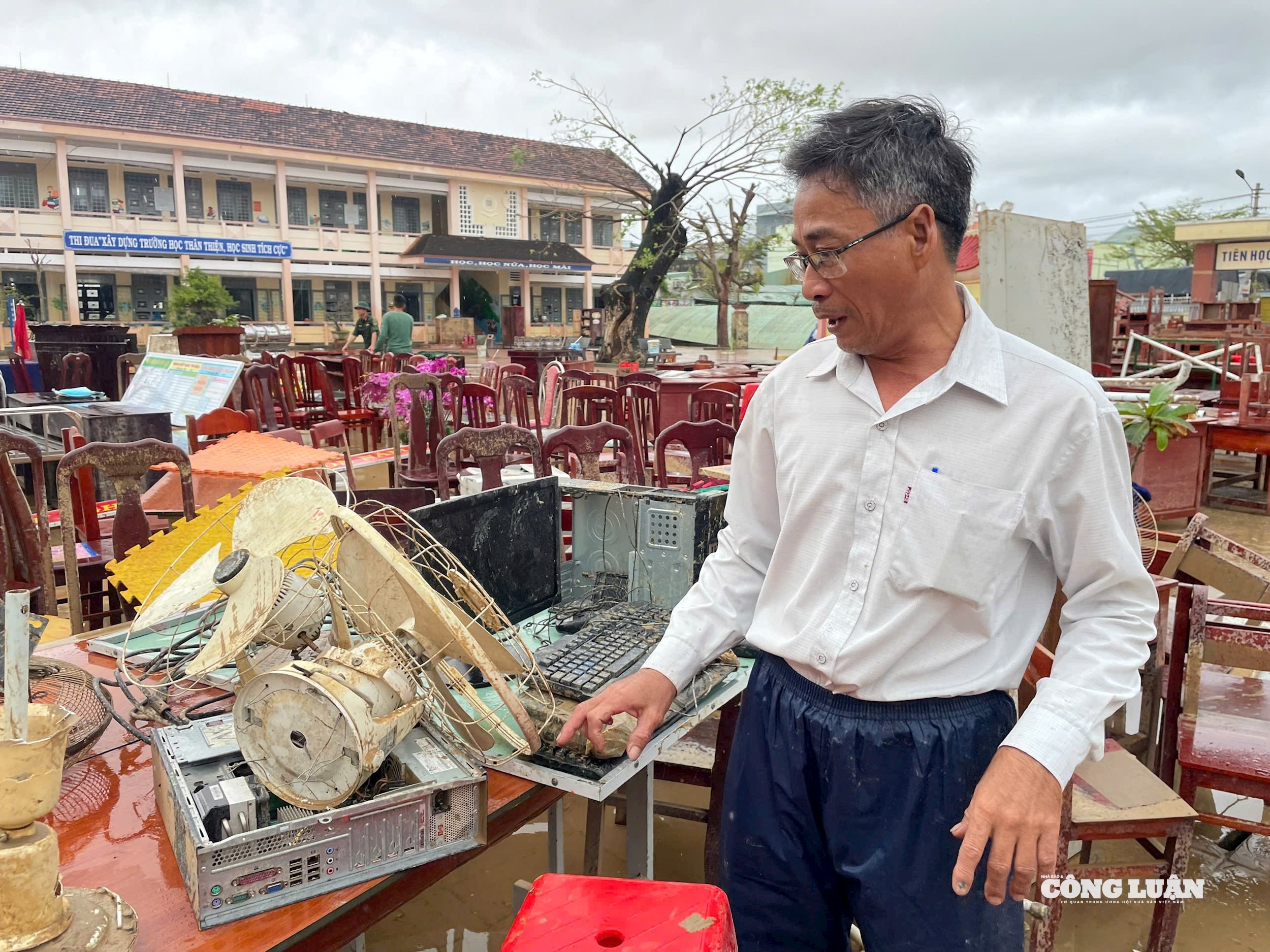 "Nước đã tràn qua tường, xô bật cửa lớp, cuốn theo bùn đất, rác và nhiều vật dụng trôi nổi. 3 giáo viên trực và 1 bảo vệ buộc ở lại trực trường bị mắc kẹt, phải chạy lên tầng 2 để tránh lũ. Nước lũ ngập sâu khiến nhiều thiết bị bị hư hỏng hoàn toàn. Trường thiệt hại khoảng 6 máy tính, một máy photocopy và hệ thống âm thanh cùng nhiều sách vở giáo viên, học sinh để lại lớp bị ướt...”, thầy Lê Văn Thất - Hiệu trưởng Trường Tiểu học số 2 Diêu Trì cho hay.