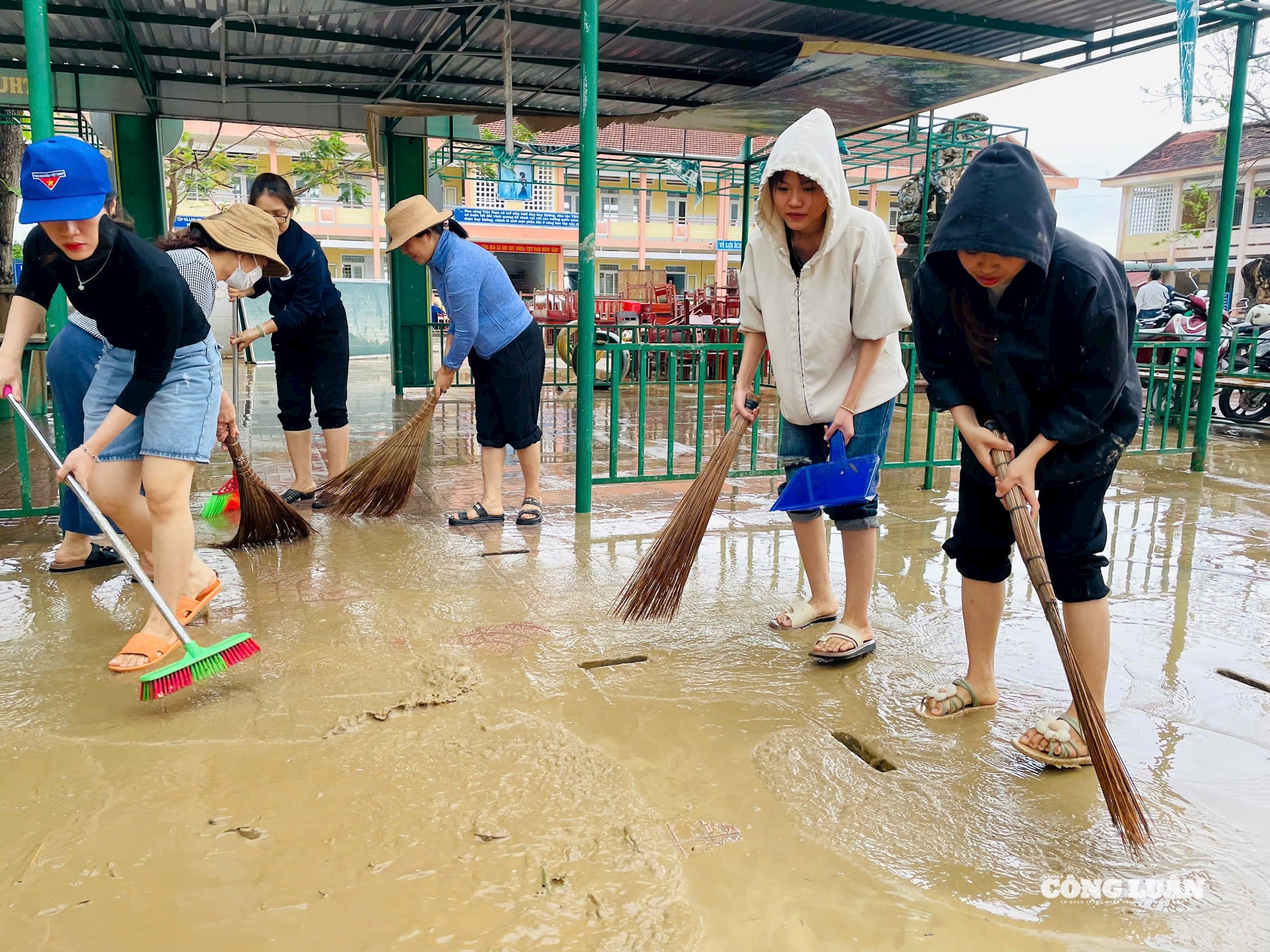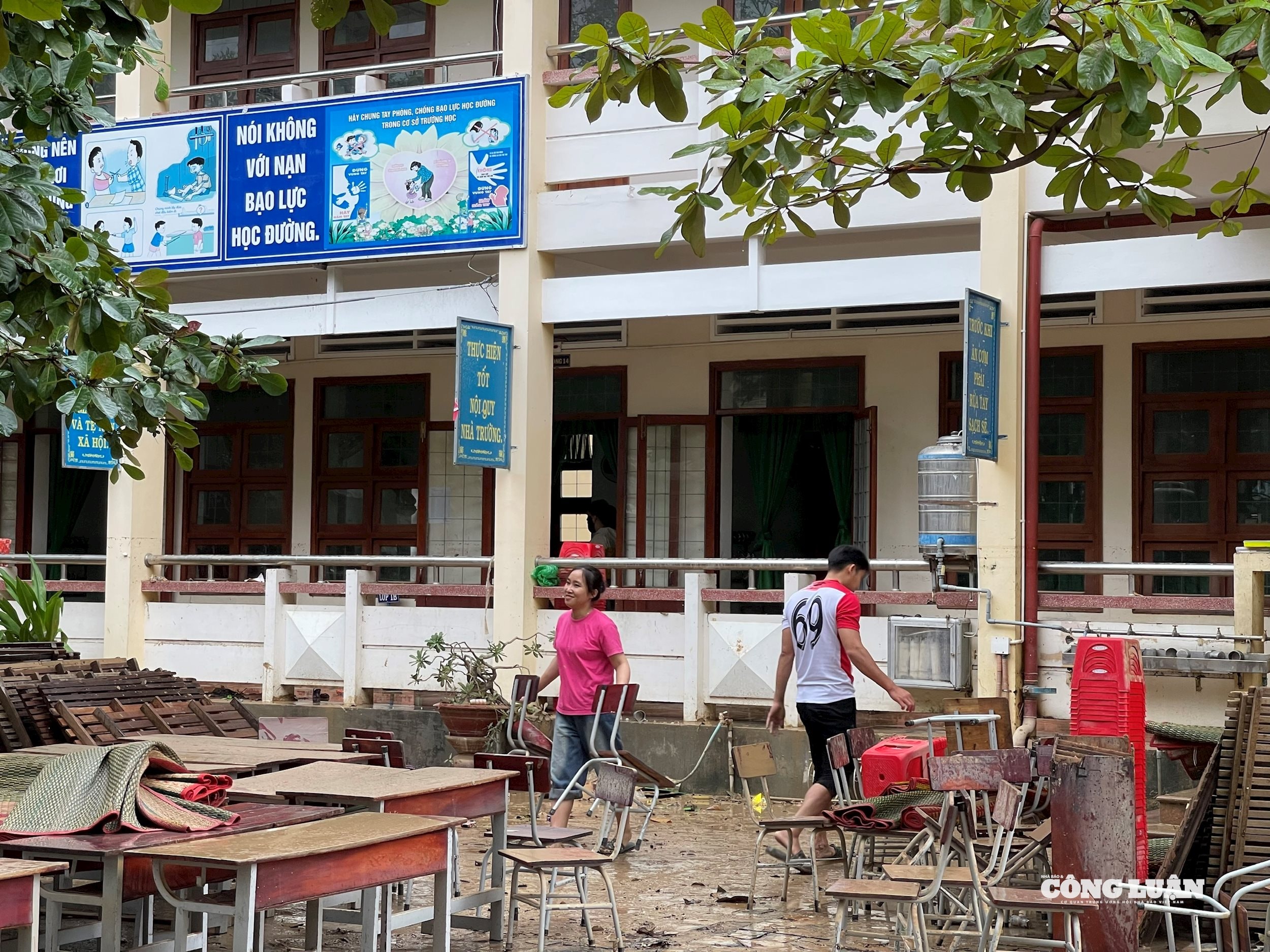 Theo thầy Minh, trong số 52 cán bộ giáo viên của trường, nhiều người nhà bị ngập sâu, liên lạc gián đoạn. Ngay khi thời tiết ổn định, hơn 30 thầy cô có thể di chuyển lập tức trở lại trường, bắt tay vào việc dọn dẹp bùn đất, phơi bàn ghế, xử lý thiết bị ngấm nước.