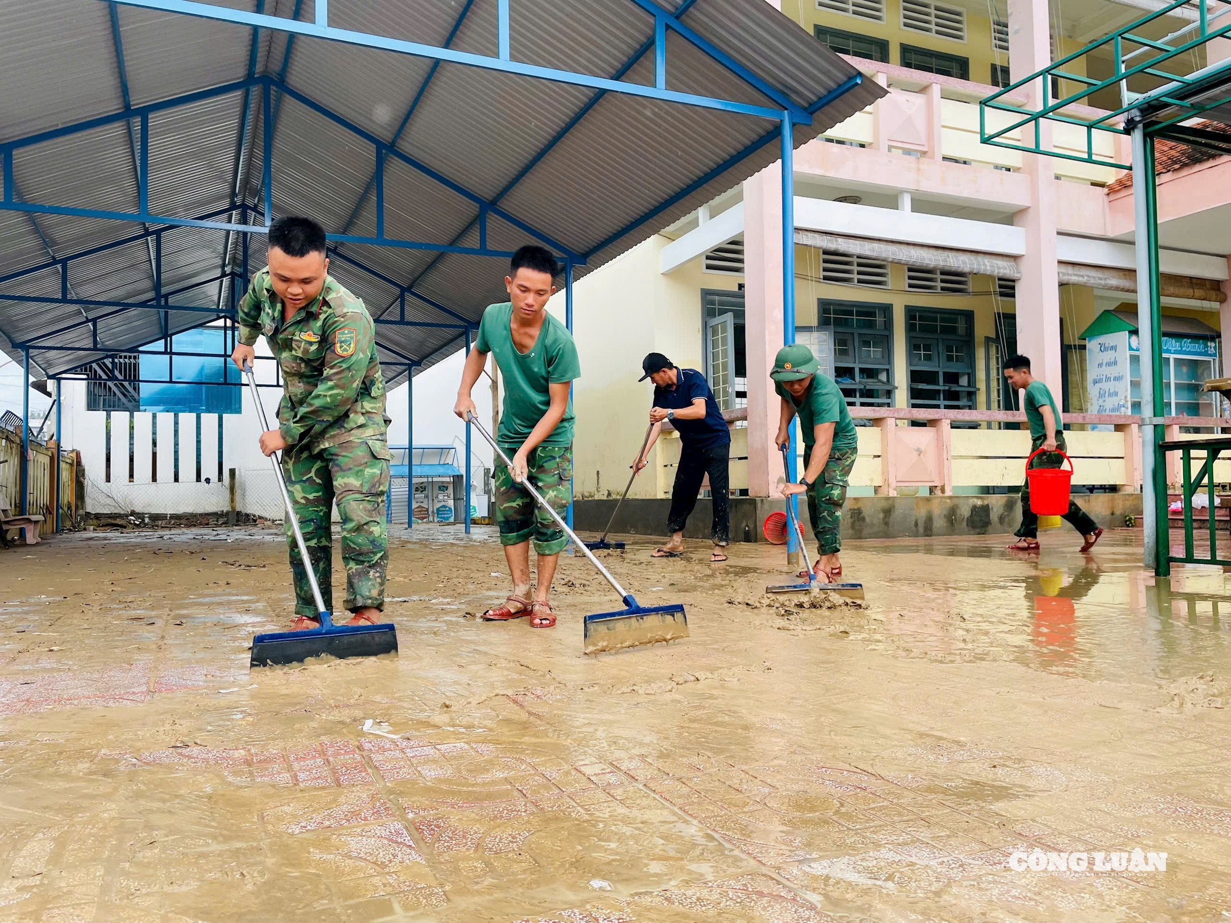 Đại úy Nguyễn Tiến Vỹ, thuộc Lữ đoàn Phòng không 573 (Quân khu 5), cho biết đơn vị đã huy động 65 cán bộ, chiến sĩ đến hỗ trợ khắc phục hậu quả tại Trường Trung học cơ sở Trần Bá và Trường Tiểu học số 2 Diêu Trị, phường Quy Nhơn Bắc. Đây là một trong những điểm trường bị ngập sâu và thiệt hại nặng sau đợt lũ vừa qua.