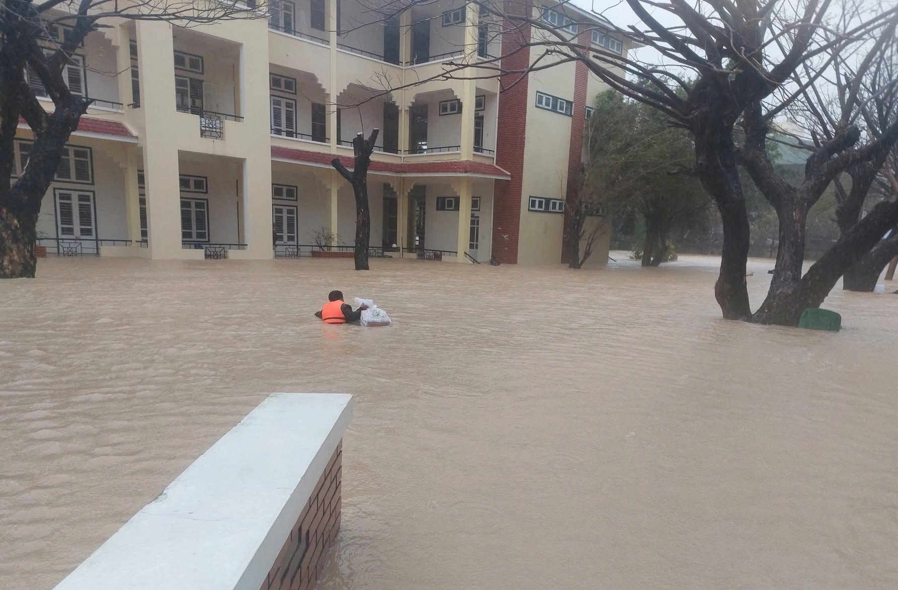 Tương tự, Trường Tiểu học số 2 Diêu Trì (xã Tuy Phước, Gia Lai), thời điểm nước lũ đổ về, toàn bộ khu vực sân trường, dãy lớp học và khu hành chính bị nhấn chìm trong dòng nước đục ngầu, nơi sâu nhất lên đến gần 2m.