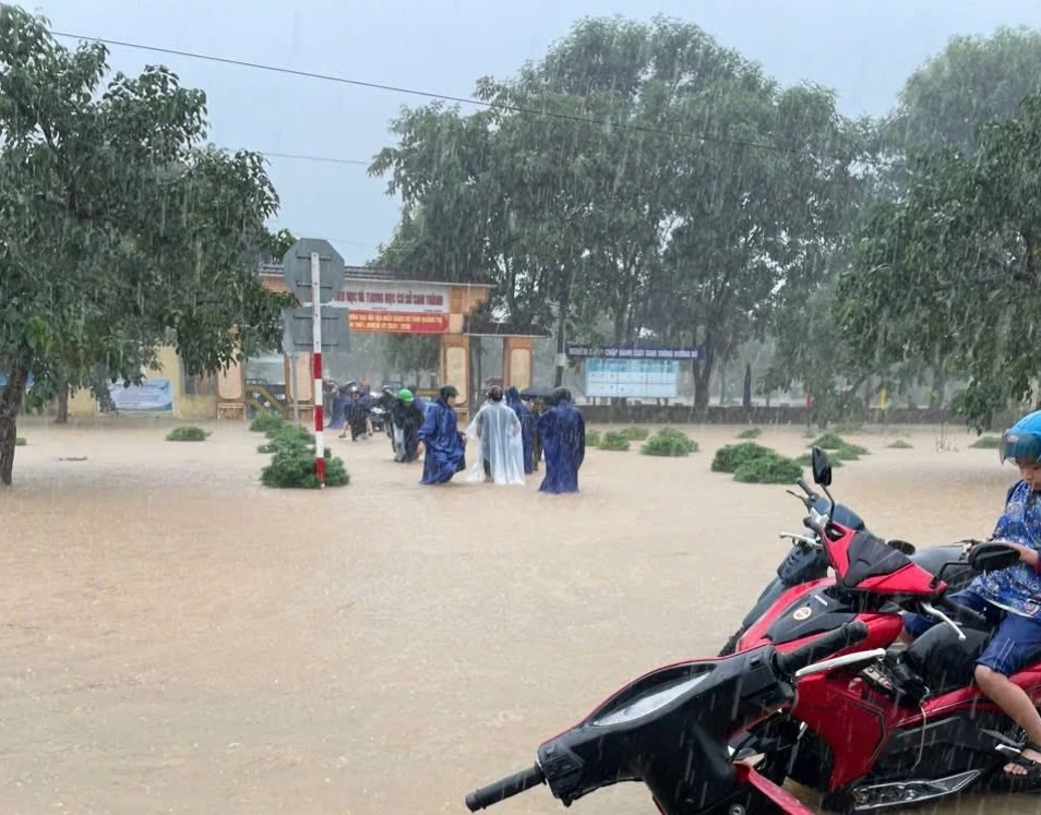 Để bảo đảm an toàn, trường học trên địa bàn xã Cam Lộ cho học sinh nghỉ học và thông báo phụ huynh đón sớm vì nguy cơ bị ngập lụt do mưa lớn.