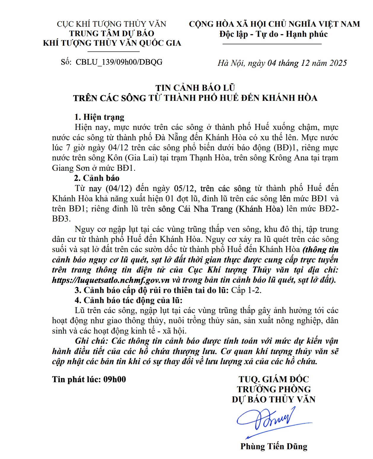 Theo Đài Khí tượng Thủy văn Khánh Hòa, mực nước trên sông Cái Nha Trang đang lên nhanh. Lúc 8 giờ ngày 4/12, mực nước đo tại trạm Đồng Trăng đạt 8,15m, cao hơn 0,15m so với báo động 1. Dự báo trong 24 giờ tới, khu vực có khả năng xuất hiện một đợt lũ mới với đỉnh lũ đạt mức báo động 2 đến báo động 3.