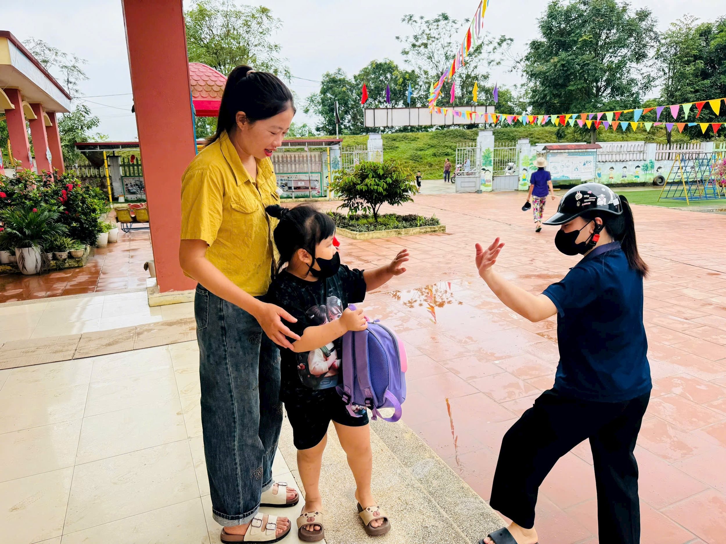 Phụ huynh đưa trẻ tới lớp.