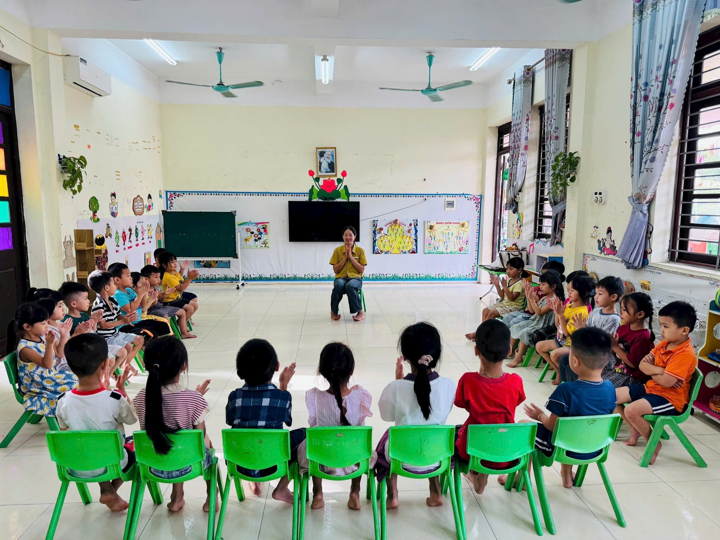 Sau những ngày gián đoạn, giờ học đầu tiên trở lại đầy ắp niềm vui — cô trò cùng nhau hát, múa, chơi trò chơi quen thuộc.