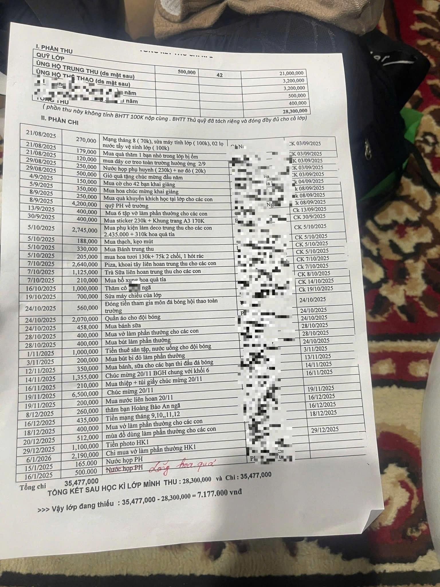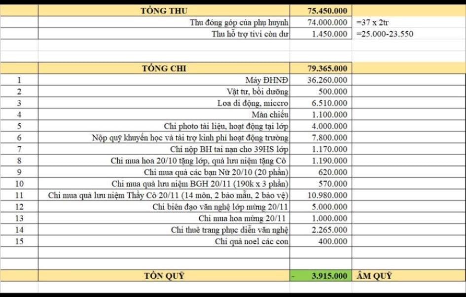 (CLO) Một bảng quyết toán quỹ lớp học kỳ I của một lớp 6 đang khiến nhiều phụ huynh không khỏi giật mình: Số tiền thu – chi lên tới gần trăm triệu đồng chỉ trong một học kỳ, với nhiều khoản chi gây tranh cãi về tính cần thiết, hợp lý và đúng mục đích.