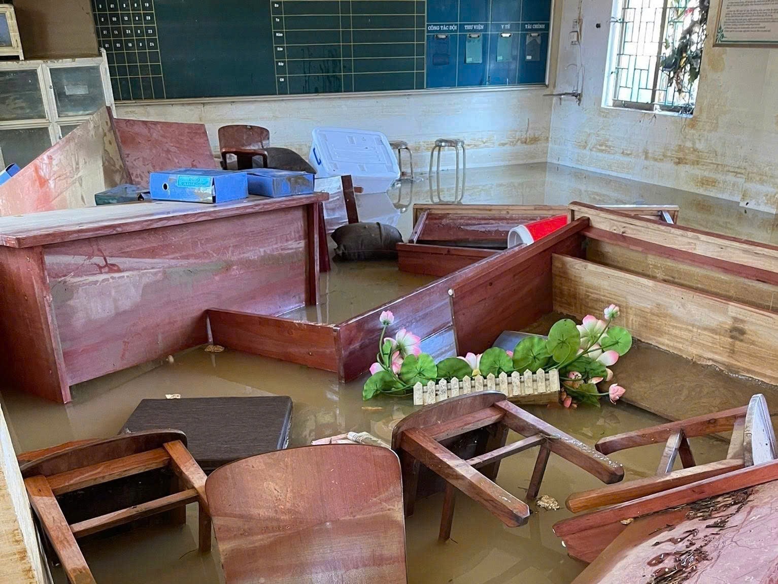 Theo cô Sáu, tường bao và nhà xe bị đổ sập, nhà hiệu bộ rạn nứt, nhiều phòng học, phòng chức năng ngập sâu trong bùn đất. Trang thiết bị dạy học hư hỏng nặng, bàn ghế, tủ kệ ngấm nước,...