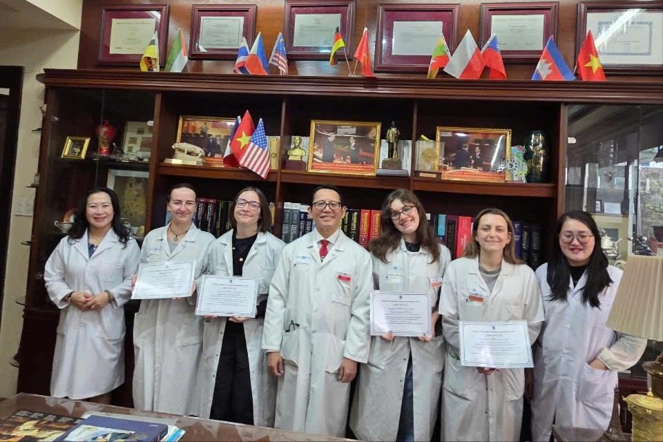 GS.TSKH.BS Dương Quý Sỹ cùng cộng sự trao chứng nhận năng lực kỹ thuật đo đa ký giấc ngủ cho sinh viên y khoa Đại học Paris Cité tại Trung tâm Đào tạo Hội Y học Giấc ngủ Việt Nam. Ảnh: NVCC