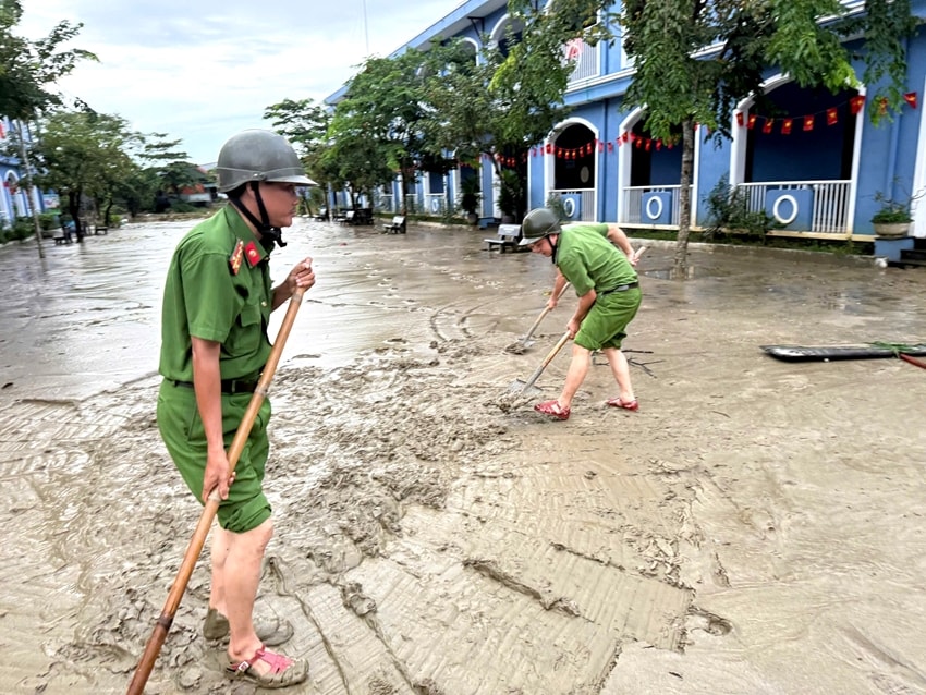 Lực lượng công an hỗ trợ dọn lũ ở Trường Tiểu học Dương Nỗ.