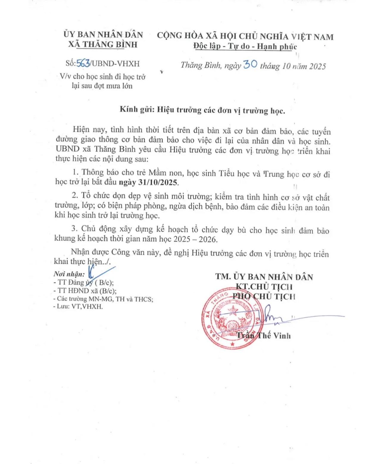 Tại xã Thăng Bình (TP Đà Nẵng), chính quyền địa phương cũng thông báo học sinh các cấp đi học trở lại từ ngày 31/10 sau khi thời tiết ổn định và giao thông được khơi thông. UBND xã yêu cầu các trường tổng vệ sinh môi trường, kiểm tra cơ sở vật chất, phòng chống dịch bệnh, đồng thời xây dựng kế hoạch dạy bù để bảo đảm khung thời gian năm học 2025–2026.