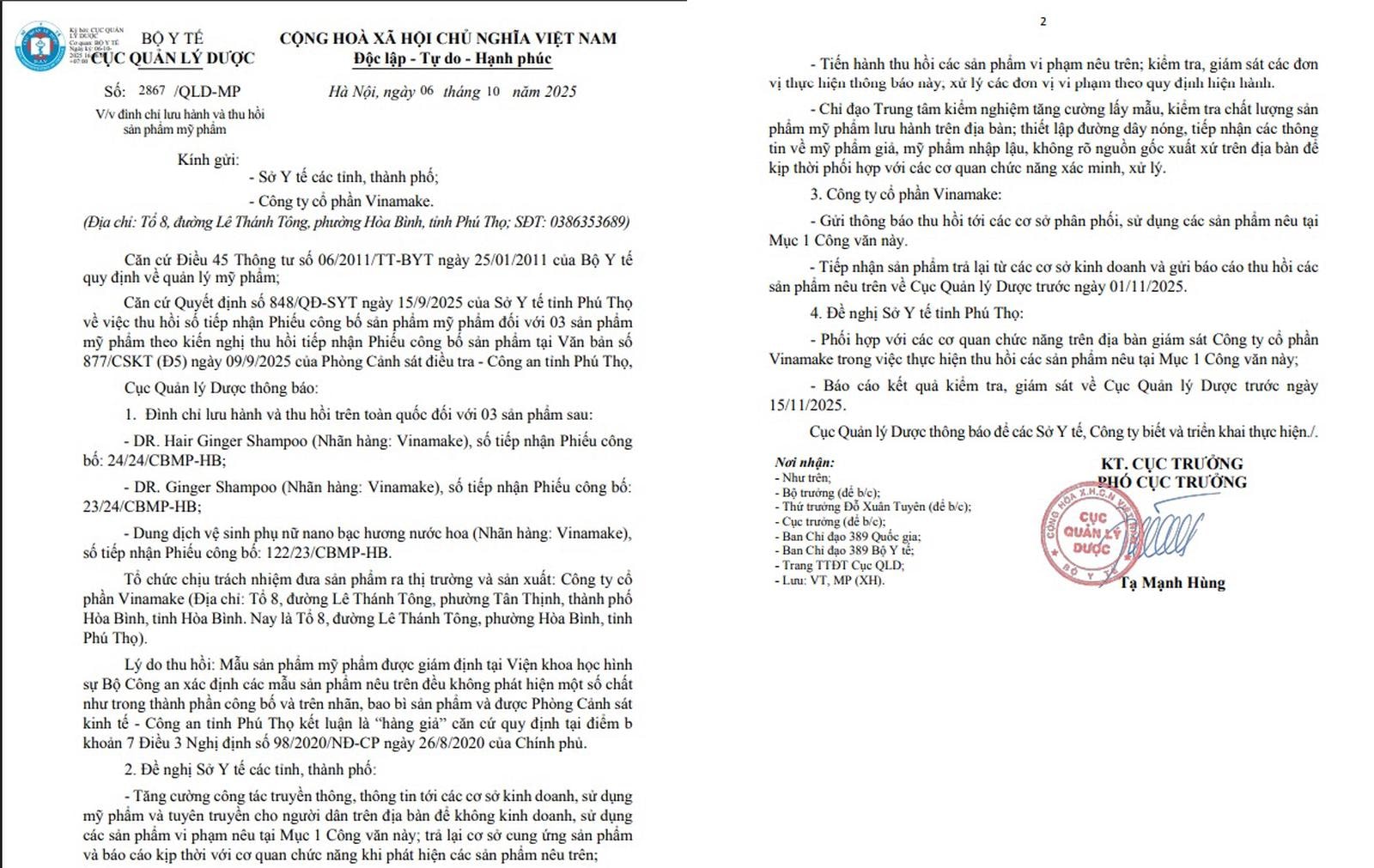 (CLO) 3 sản phẩm mỹ phẩm mang nhãn hiệu Vinamake, gồm dầu gội Dr. Hair Ginger, Dr. Ginger và dung dịch vệ sinh phụ nữ nano bạc hương nước hoa vừa bị Cục Quản lý Dược (Bộ Y tế) đình chỉ lưu hành và thu hồi trên toàn quốc sau khi bị cơ quan công an kết luận là hàng giả.