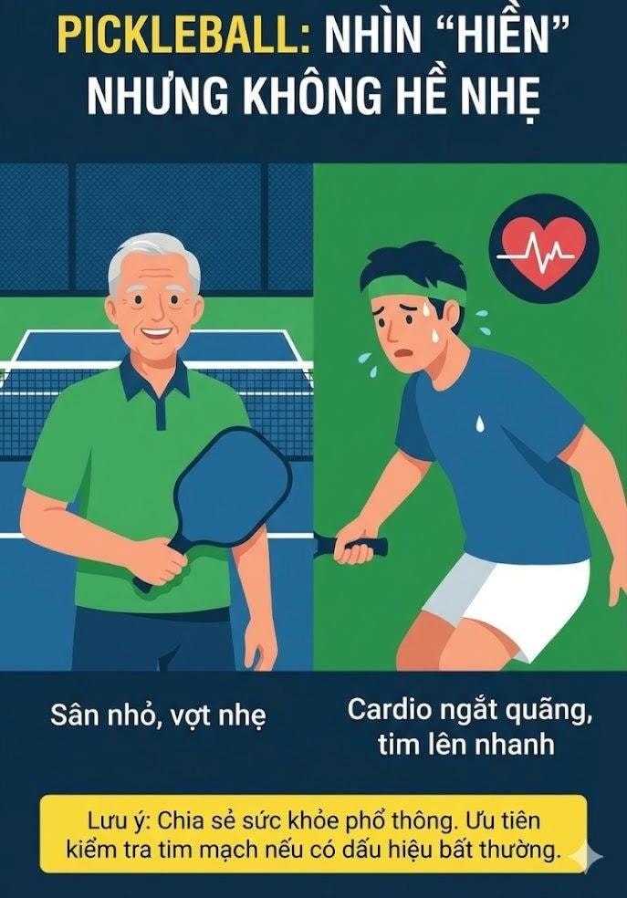 Bù lại, nếu được kiểm soát tốt, pickleball mang lại lợi ích tim mạch rõ rệt. Sự dao động cường độ giúp cải thiện độ đàn hồi mạch máu, tăng khả năng tưới máu ngoại vi và hỗ trợ kiểm soát cân nặng nhờ hiện tượng “nợ oxy sau vận động”, khi cơ thể tiếp tục tiêu hao năng lượng ngay cả sau khi rời sân.
