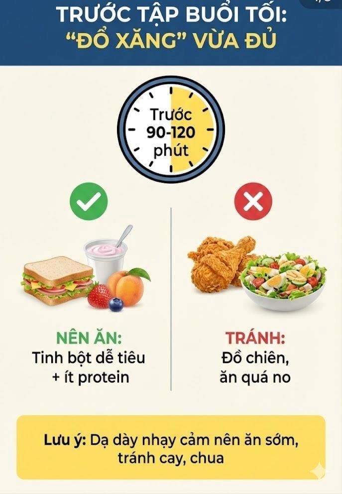 Khung giờ chơi phổ biến buổi tối, sau một ngày làm việc căng thẳng, đặt ra thách thức lớn cho hệ tiêu hóa và giấc ngủ. Bữa ăn trước khi ra sân cần đủ năng lượng nhưng không quá nặng; trong khi bữa ăn sau tập phải giúp cơ thể chuyển sang trạng thái phục hồi, thay vì bị bỏ đói hoặc “xả láng” bằng đồ chiên rán, bia rượu.