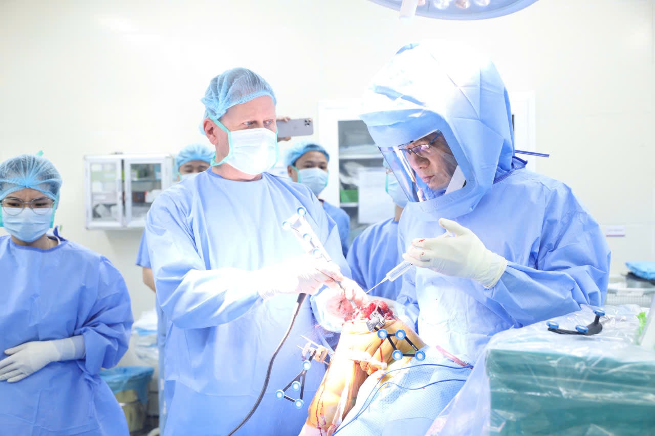 Triển khai hệ thống Robot Cori trong phẫu thuật thay khớp gối toàn phần đầu tiên tại Việt Nam. Ảnh: NB&CL