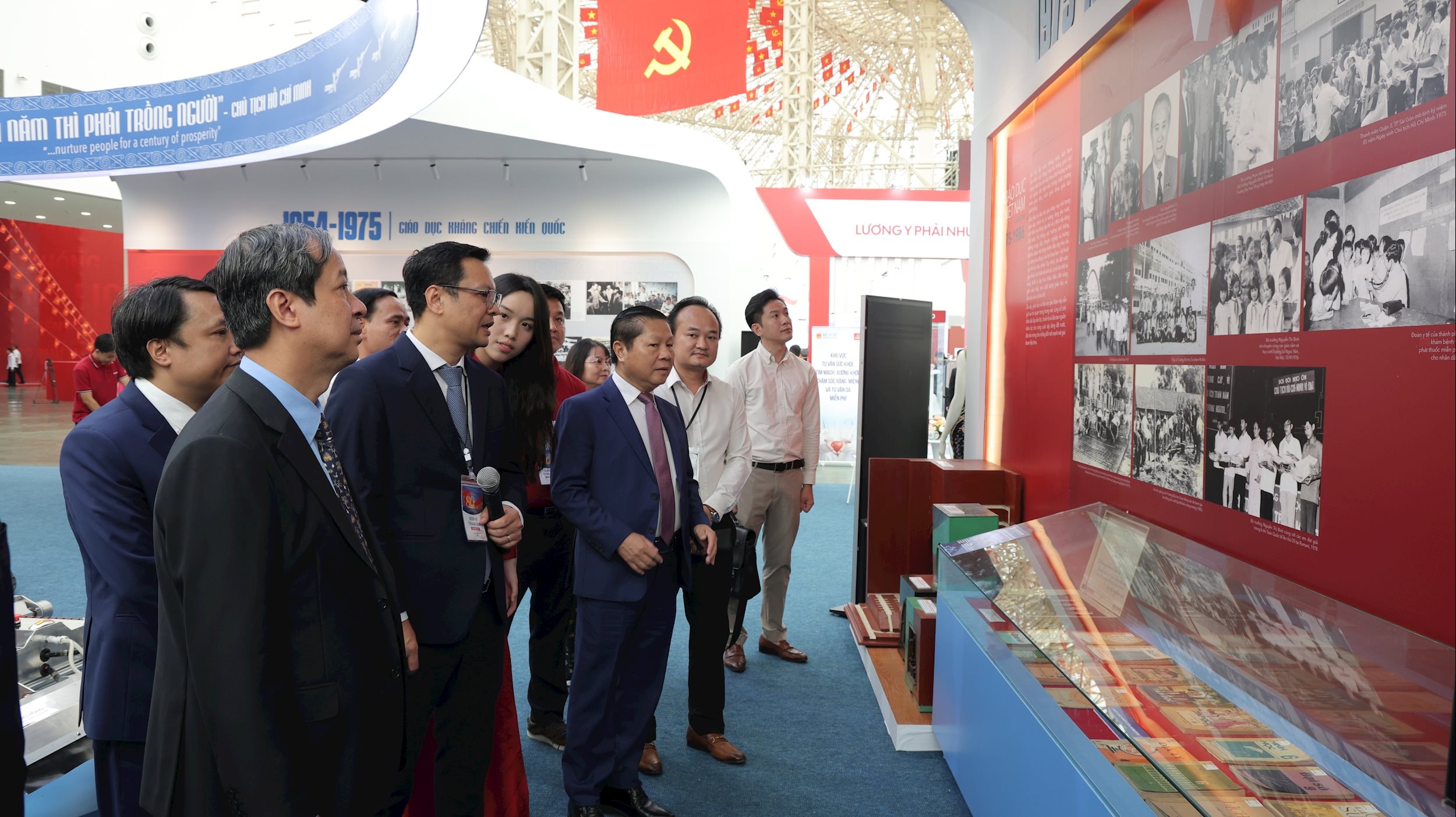 Các đại biểu tham quan gian triển lãm của Bộ GD&ĐT với chủ đề: 80 năm thành tựu giáo dục và đào tạo” và Không gian “Sáng tạo để kiến thiết".