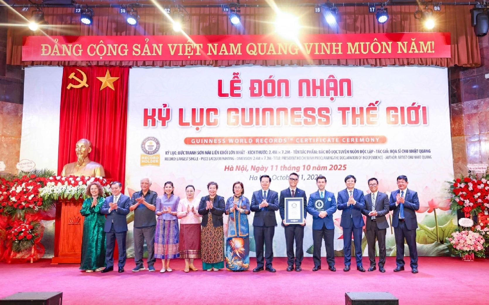 (CLO) Chiều 11/10, tại Hà Nội, Ban Tuyên giáo và Dân vận Trung ương phối hợp với Bộ Văn hóa, Thể thao và Du lịch, Bảo tàng Hồ Chí Minh và gia đình họa sĩ Chu Nhật Quang tổ chức Lễ đón nhận Kỷ lục Guinness Thế giới cho tác phẩm “Bác Hồ đọc Tuyên ngôn Độc lập” – bức tranh sơn mài liền khối lớn nhất thế giới.