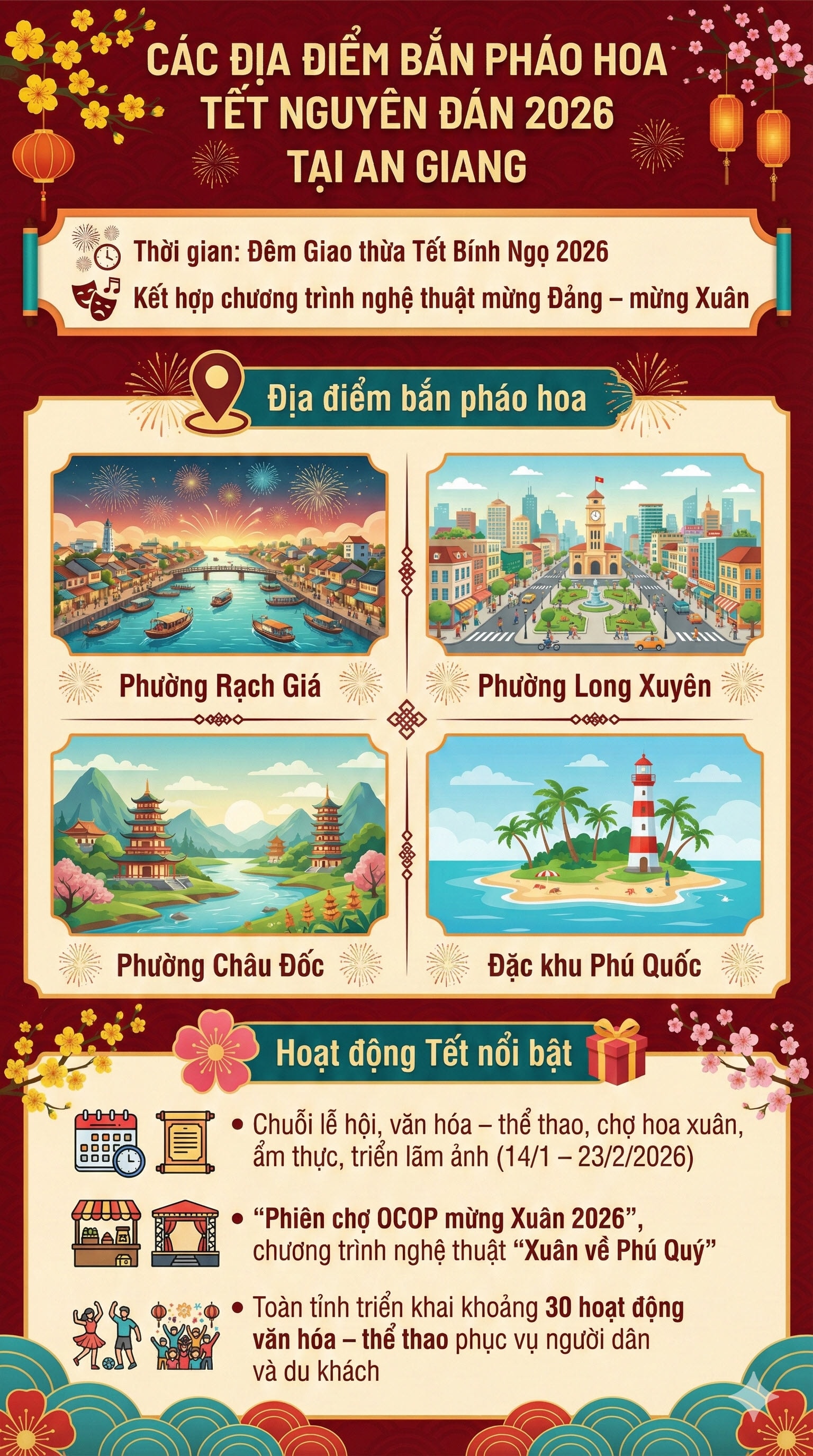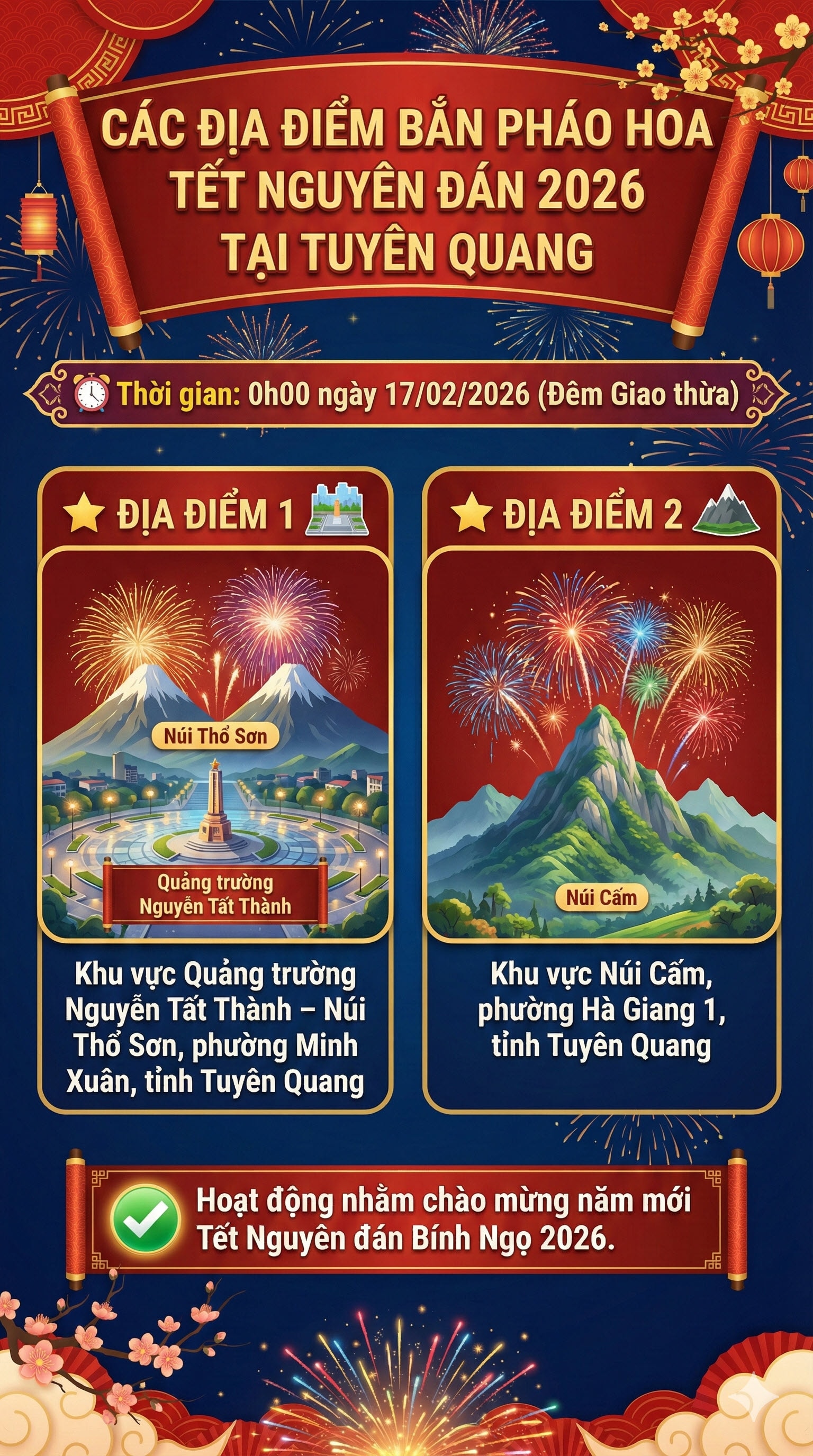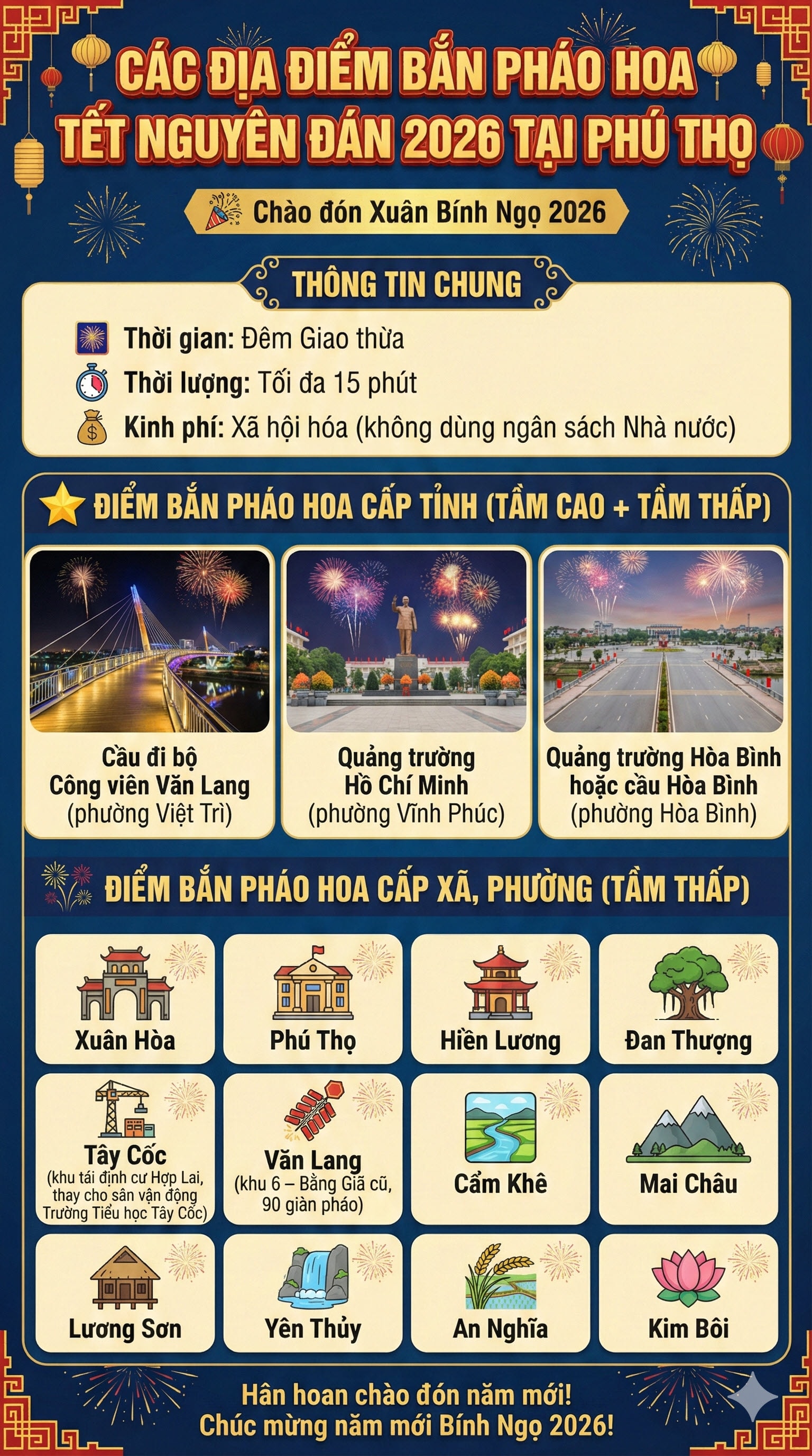 Tết Nguyên đán Bính Ngọ 2026, nhiều tỉnh thành trên cả nước sẽ tổ chức bắn pháo hoa chào đón năm mới tại các quảng trường, khu trung tâm và điểm du lịch lớn, mang đến không khí lễ hội rộn ràng cho người dân.