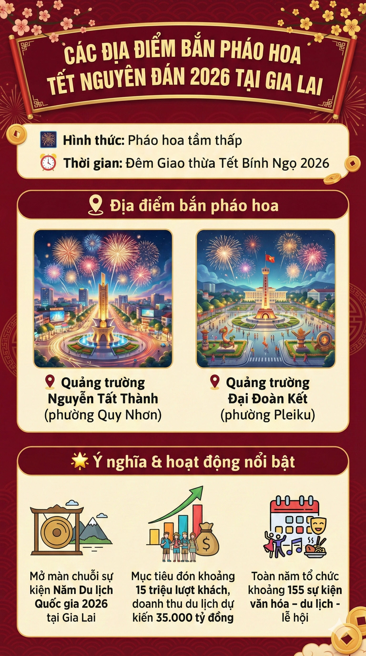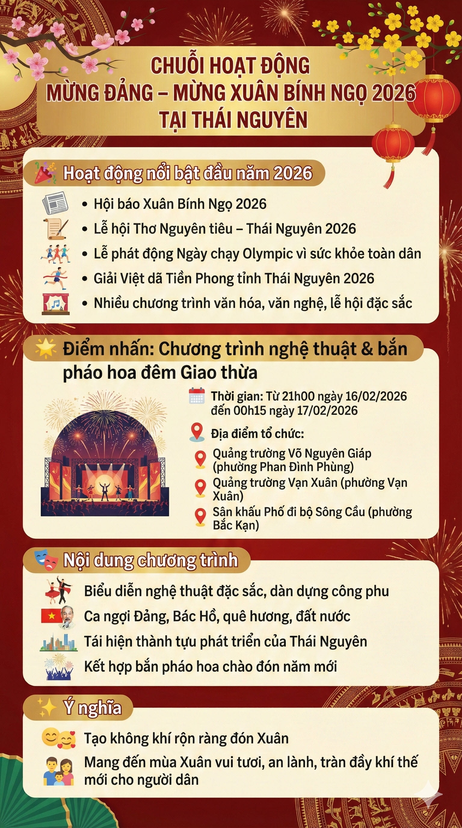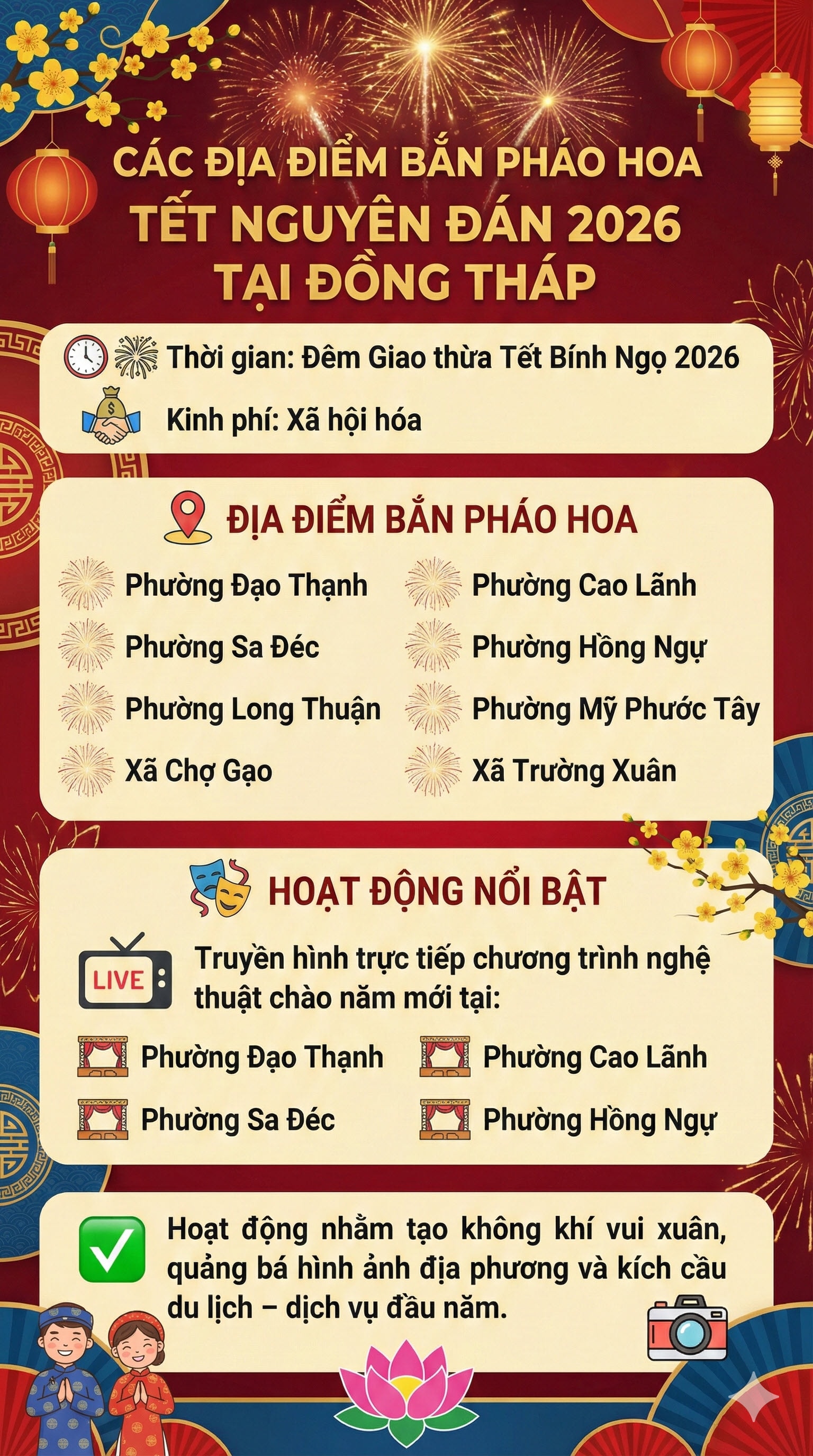 Tết Nguyên đán Bính Ngọ 2026, nhiều tỉnh thành trên cả nước sẽ tổ chức bắn pháo hoa chào đón năm mới tại các quảng trường, khu trung tâm và điểm du lịch lớn, mang đến không khí lễ hội rộn ràng cho người dân.