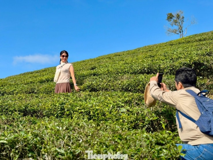 Trong không gian se lạnh đầu năm, đồi chè Cầu Đất tại phường Xuân Trường thu hút đông đảo du khách nhờ những luống chè xanh mướt trải dài dưới ánh nắng ban mai và làn sương mỏng.