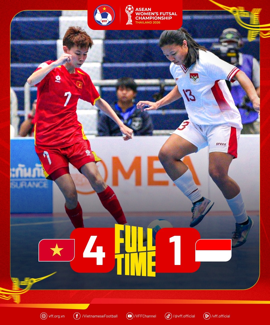 • Tuyển futsal nữ Việt Nam ngược dòng trước Indonesia, giành hạng 3 Đông Nam Á. Trong trận đấu với Indonesia, đội tuyển futsal nữ Việt Nam đá đối diện với nhiều khó khăn nhưng bản lĩnh và đẳng cấp của các cầu thủ đã được thể hiện đúng lúc. Nhờ đó, đội tuyển giành chiến thắng 4-1 và cán đích ở vị trí thứ 3.