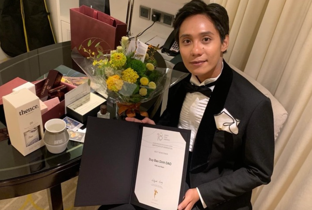 Bảo Định nhận giải Tân binh xuất sắc tại "Asian Film Awards". Ảnh: FBNV