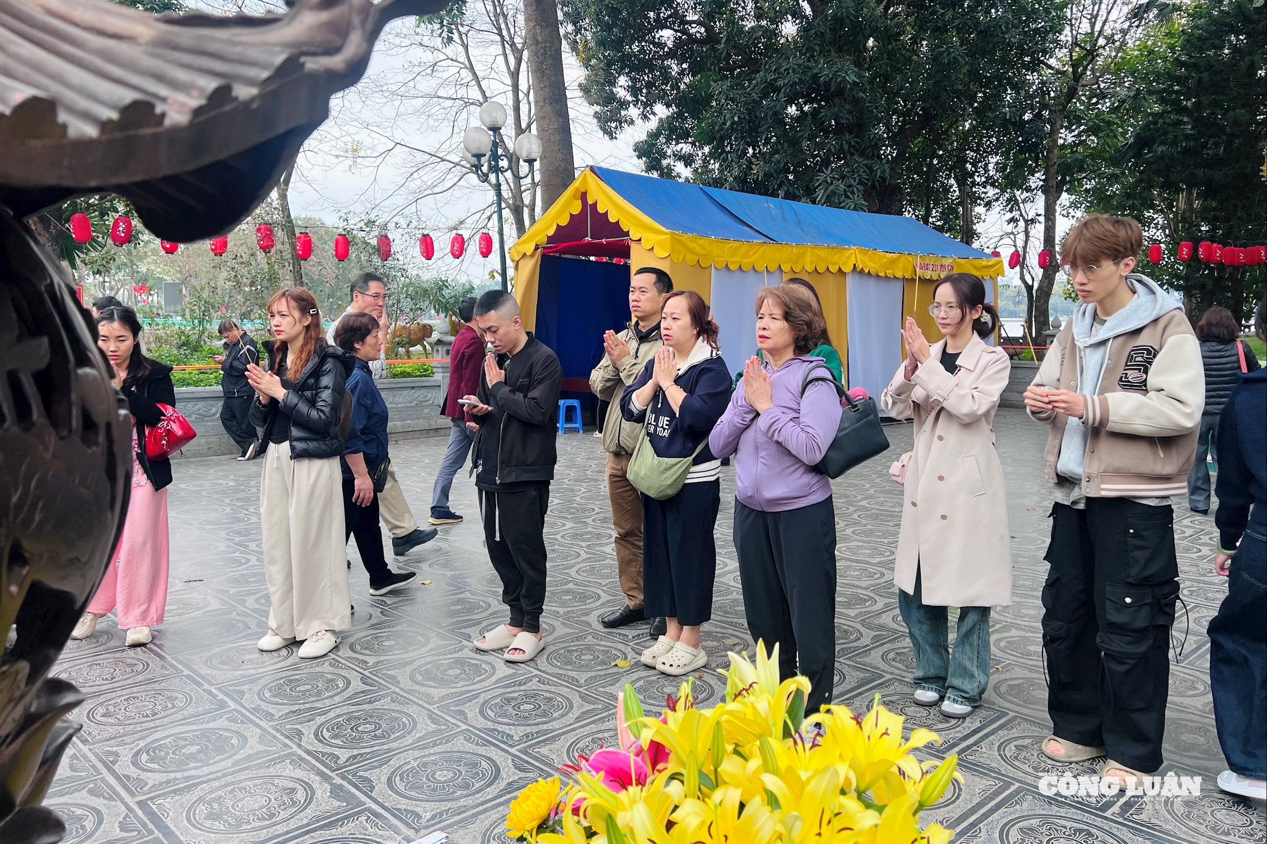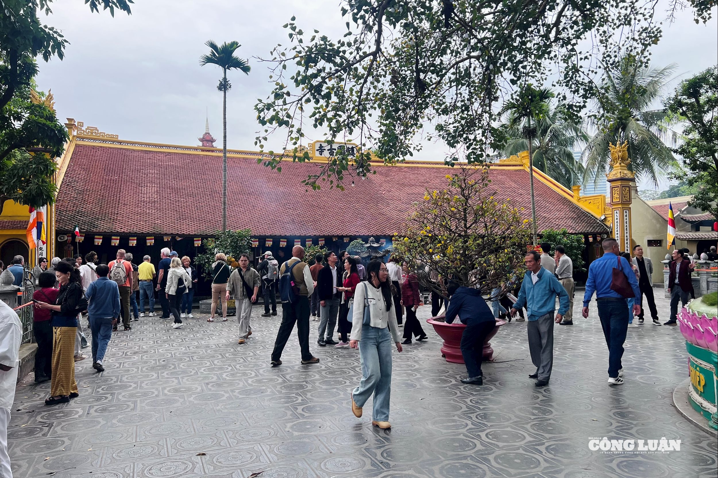 Theo ghi nhận vào buổi trưa, từ lối vào chính đến các khu vực thờ tự luôn đông đúc người xếp hàng thắp hương và khấn bái với trật tự. Nhiều gia đình, nhóm bạn và du khách nước ngoài cũng đến tham quan, chụp ảnh và tìm hiểu kiến trúc cổ kính của ngôi chùa nằm bên bờ Hồ Tây – một trong những điểm đến tâm linh và du lịch văn hóa nổi bật của Hà Nội.
