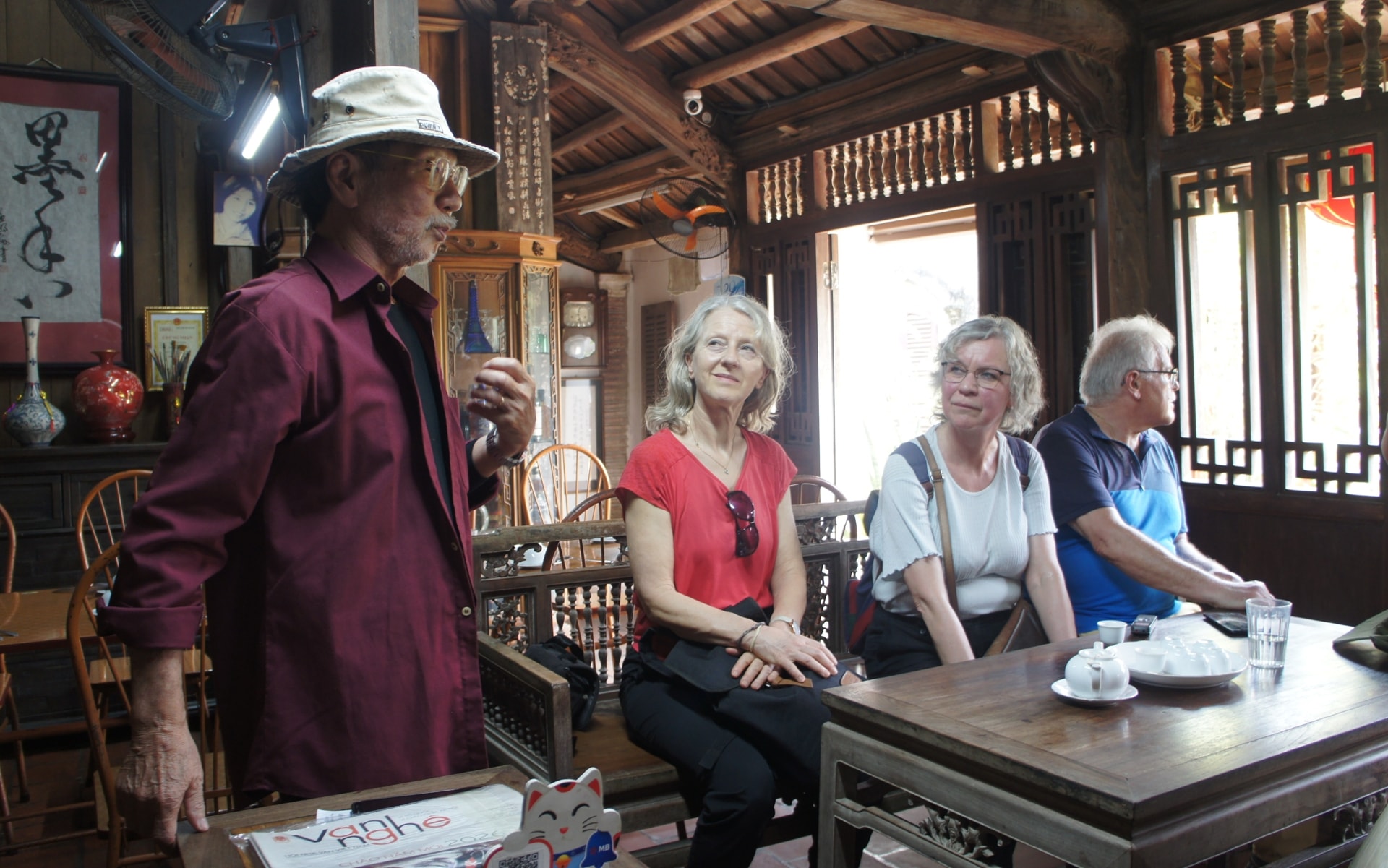 Ông Hà Nguyên Huyến giới thiệu về ngôi nhà cổ của gia đình với đoàn du khách đến từ Đức.