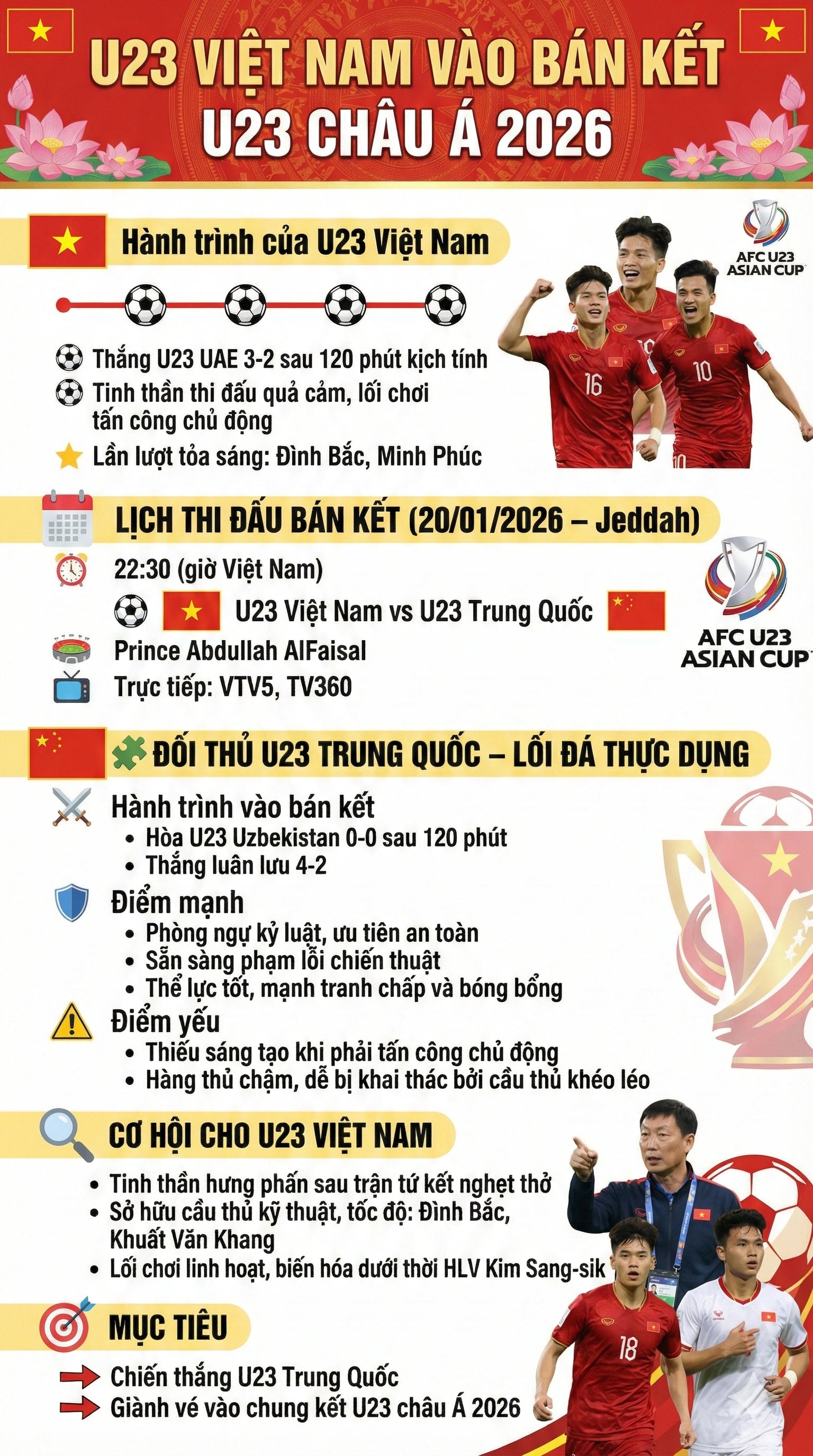 Lịch thi đấu bán kết U23 châu Á 2026: U23 Việt Nam đại chiến U23 Trung Quốc. Nhận định cơ hội vào chung kết và "giải mã" lối đá thực dụng khó chịu của đối thủ.