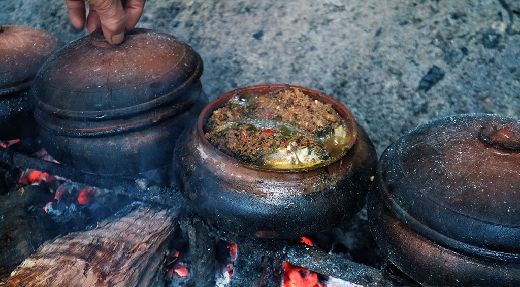 Đặc sản cá kho làng Đại Hoàng (xã Nam Lý, tỉnh Ninh Bình) chín vàng trên bếp lửa. Ảnh: BNB