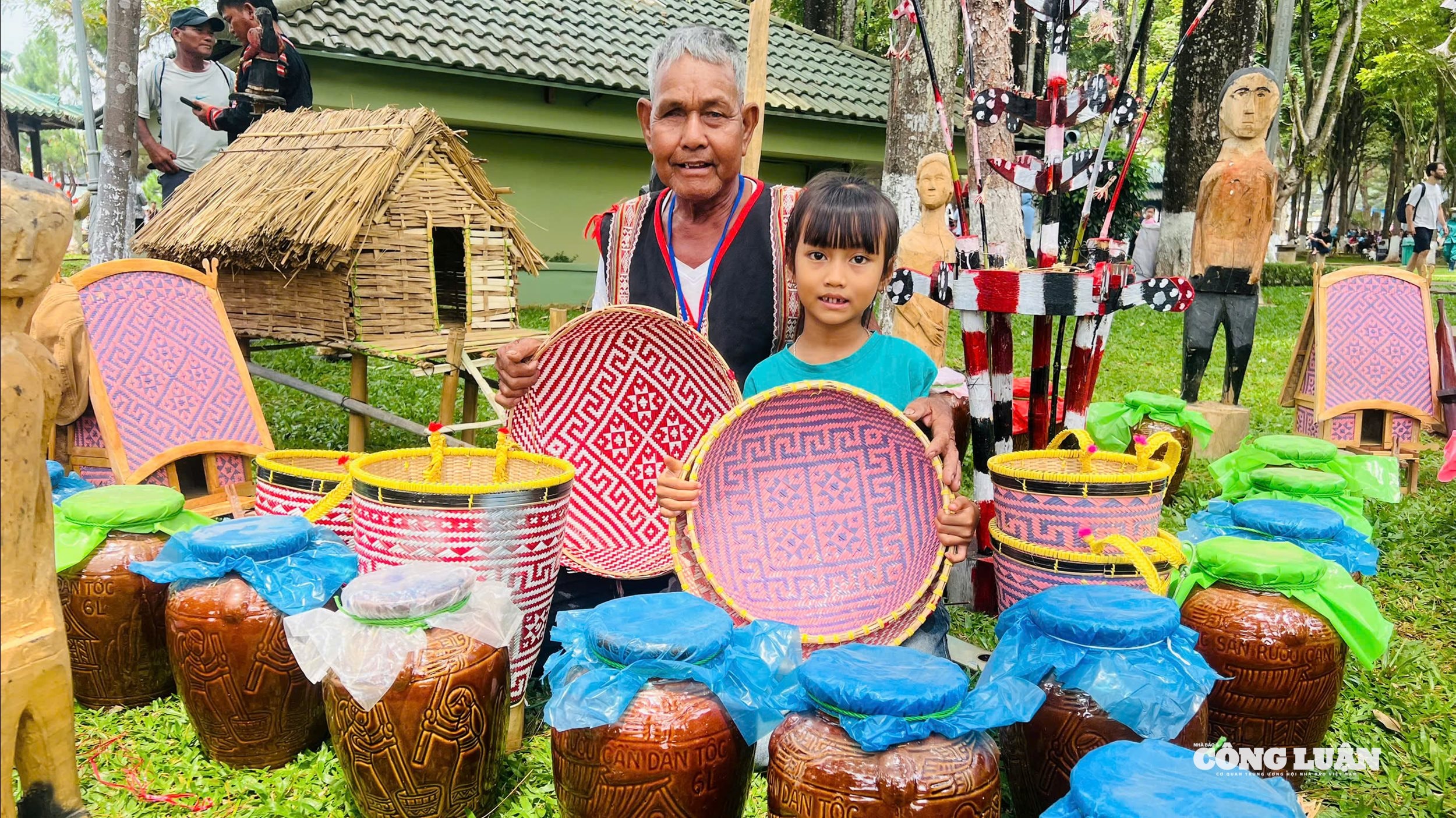 Nghệ nhân Đinh Nhiêu cùng người cháu mang những sản phẩm cho chính ông tạo ra đến ngày hội