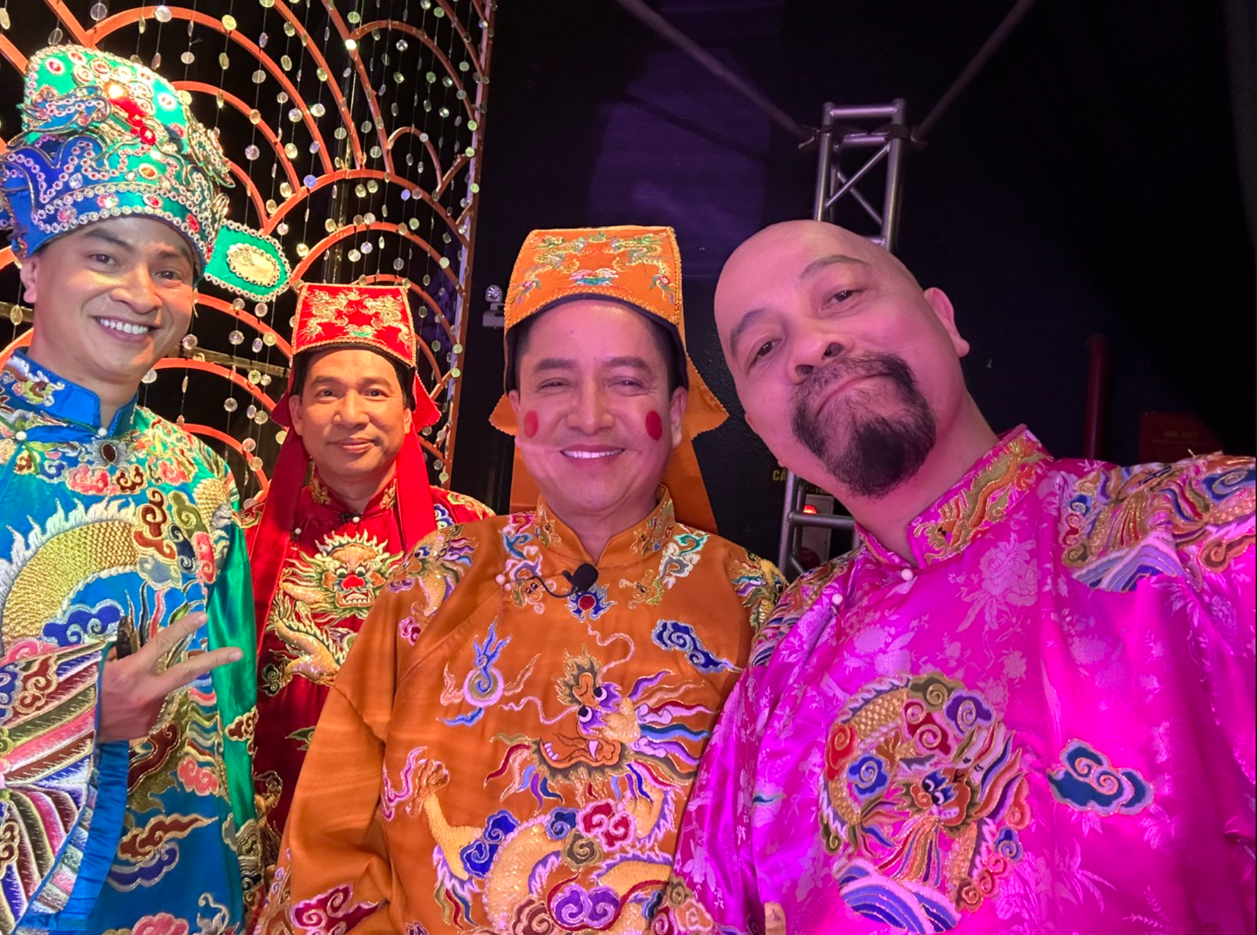 NSƯT, nhà thiết kế Đức Hùng (bìa phải); nghệ sĩ Chí Trung (thứ 2 từ phải qua) cùng các diễn viên trẻ ở phía sau hậu trường sân khấu chương trình Táo Quân. Ảnh: NVCC
