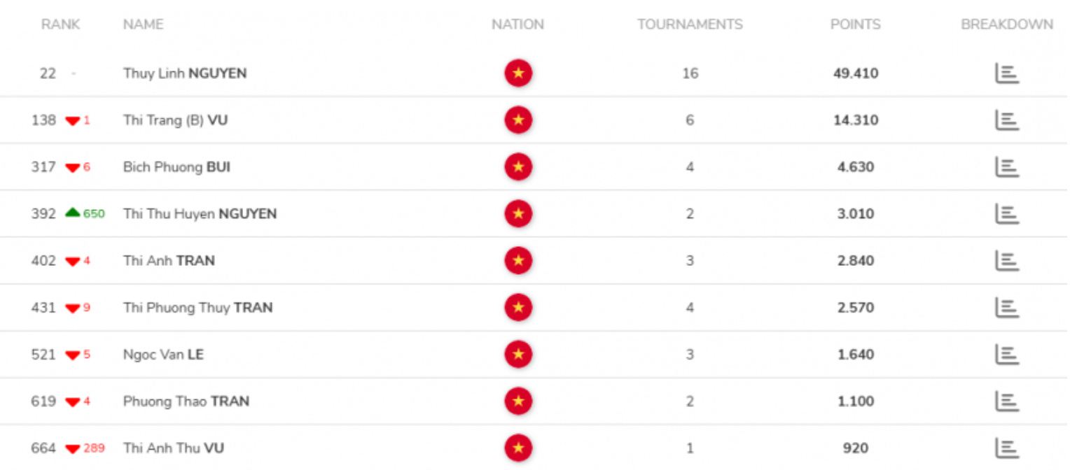 (CLO) Tay vợt nữ mới 14 tuổi Nguyễn Thị Thu Huyền vừa tạo bước tiến ngoạn mục khi tăng 655 bậc trên BXH của Liên đoàn Cầu lông Thế giới (BWF).
