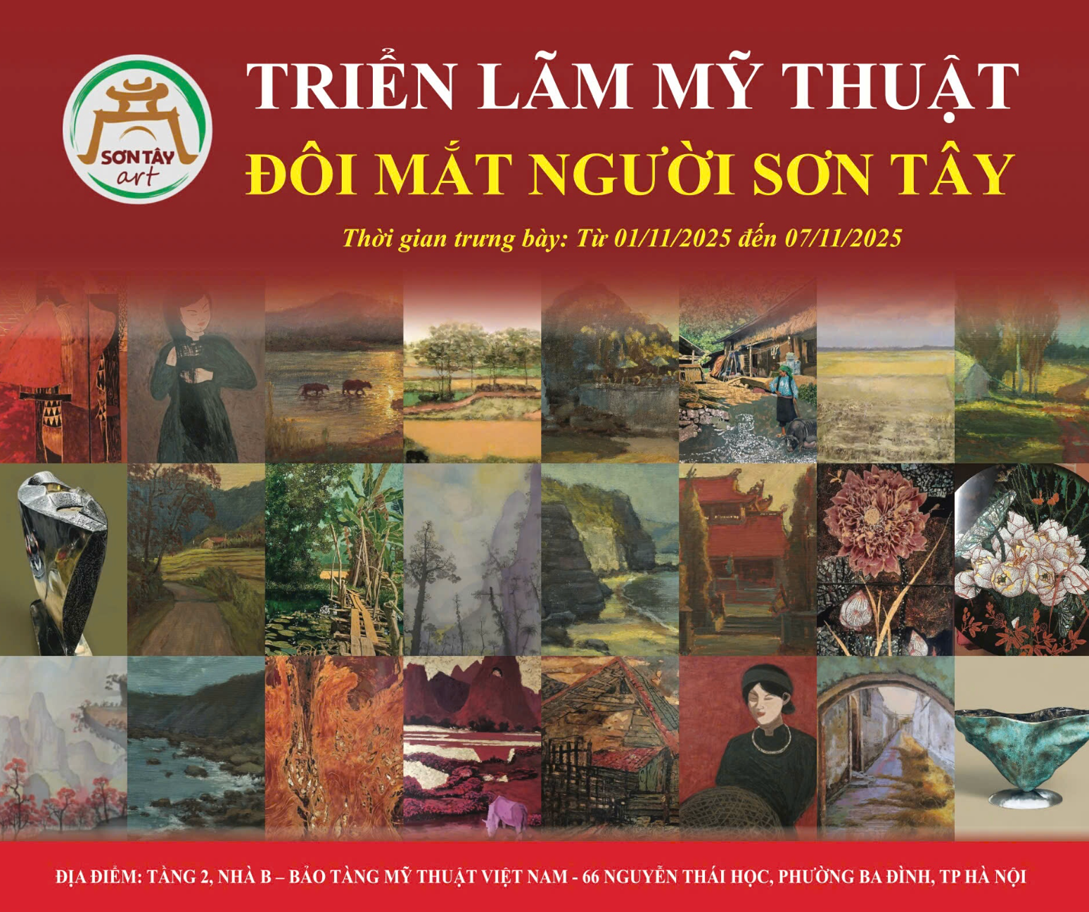Triển lãm “Đôi mắt người Sơn Tây” mở cửa đến hết ngày 7/11/2025 tại tầng 2, Nhà B – Bảo tàng Mỹ thuật Việt Nam (66 Nguyễn Thái Học, Ba Đình, Hà Nội).