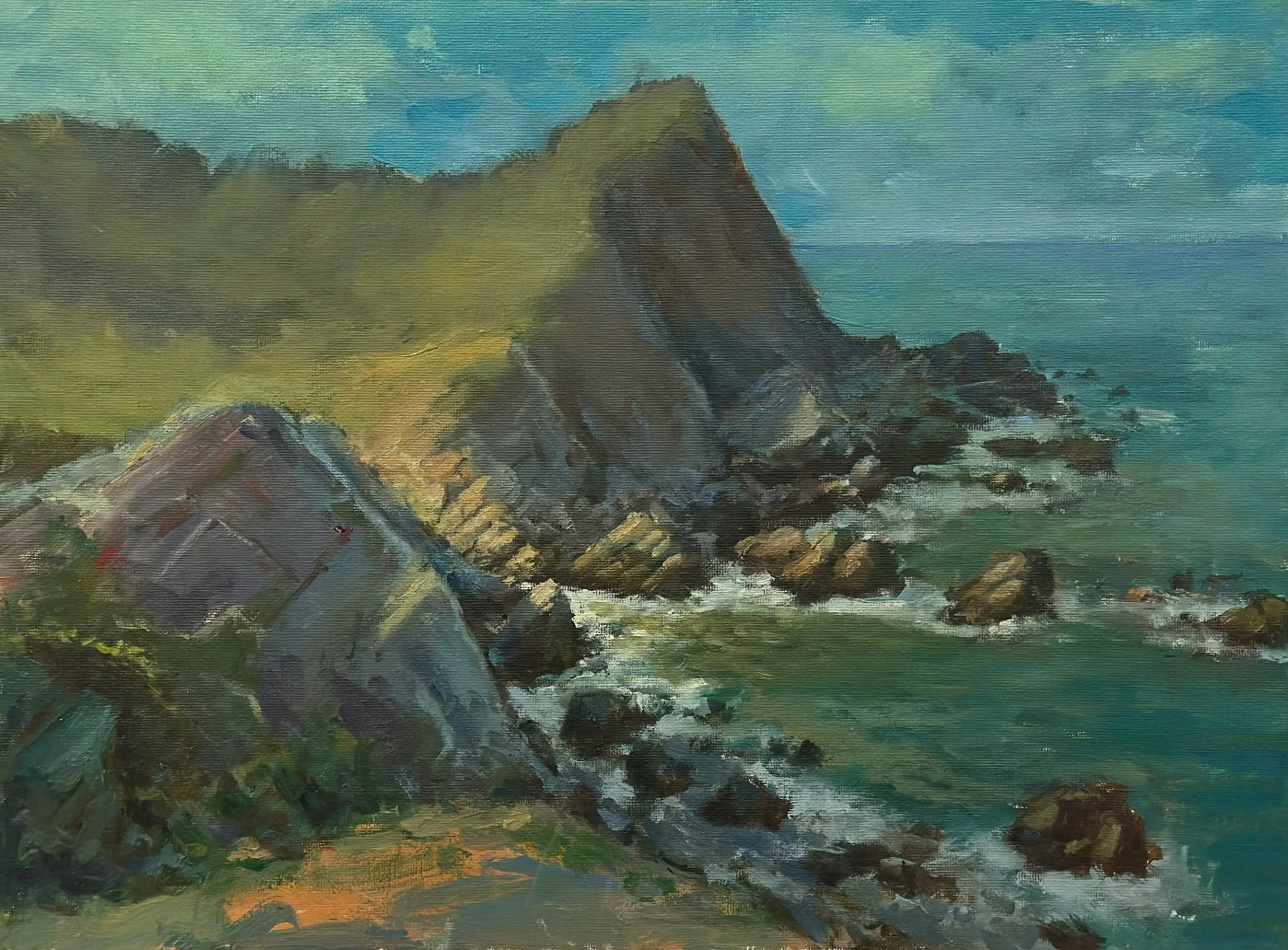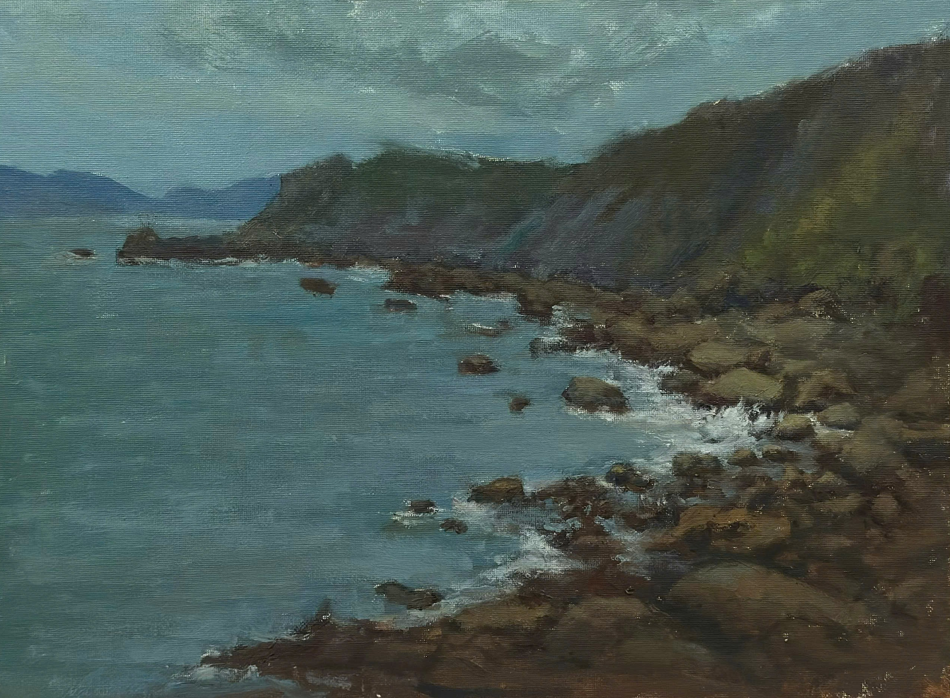 Tác phẩm: Bãi đá Quan Lạn; Kích thước: 30 x 40cm; Chất liệu: Sơn dầu; Năm sáng tác: 2025; Tác giả: Đinh Hồng Quân.