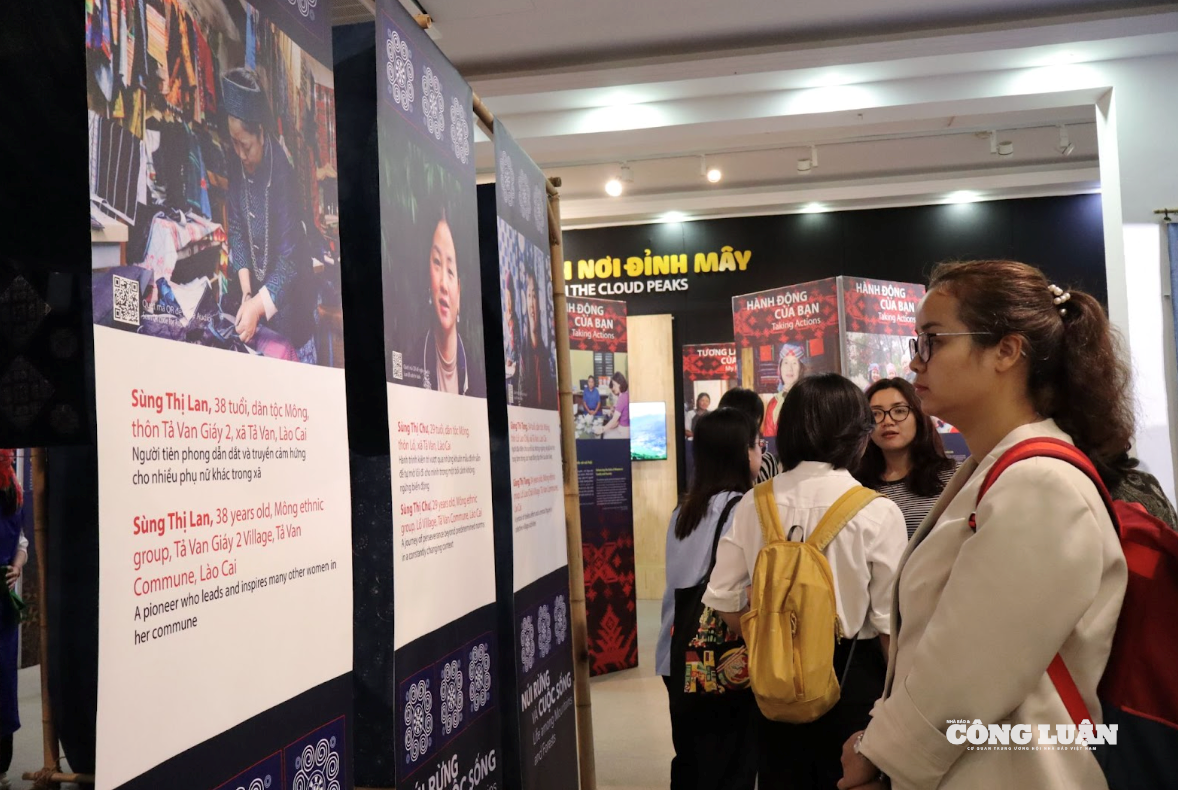 Khách tham quan tìm hiểu thông tin, câu chuyện về phụ nữ vùng cao tại triển lãm. Ảnh: Trần Phương