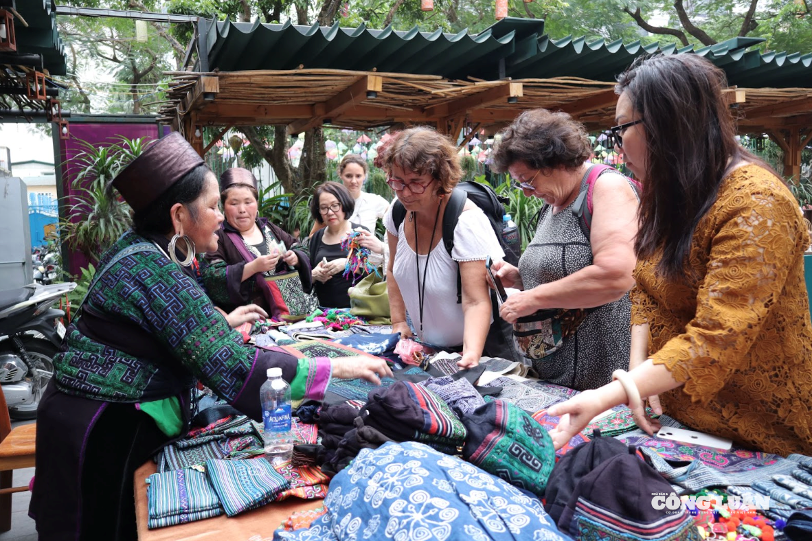 Người dân địa phương giới thiệu các sản phẩm thủ công truyền thống tới khách tham quan. Ảnh: Trần Phương