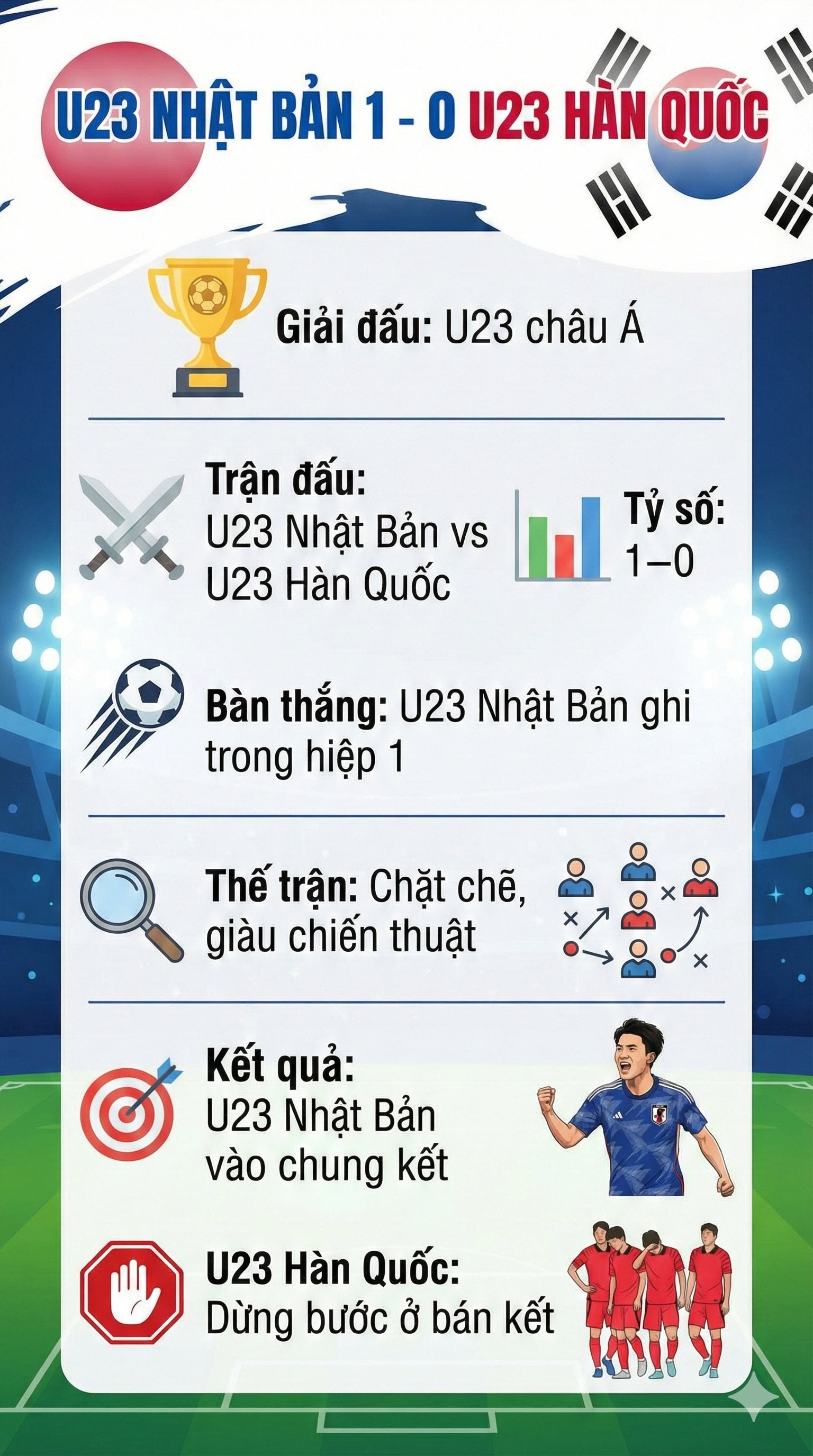 U23 Nhật Bản đánh bại U23 Hàn Quốc với tỷ số 1–0 trong trận bán kết căng thẳng, qua đó giành vé vào chung kết U23 châu Á nhờ lối chơi kỷ luật và hiệu quả.